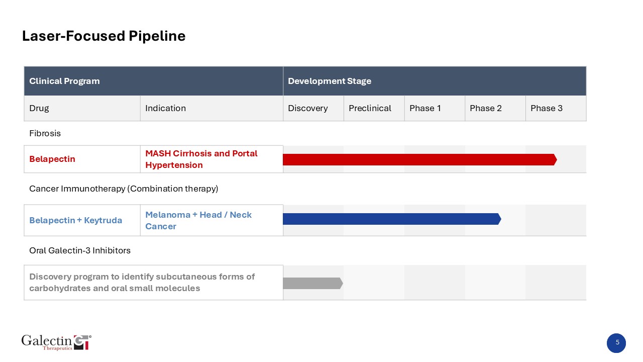 Clinical Program  Development Stage  Drug  Indication  Discovery  Preclinical  Phase 1  Phase 2  Phase 3  Fibrosis  Belapectin  MASH Cirrhosis and Portal Hypertension  Cancer Immunotherapy (Combination therapy)  Belapectin + Keytruda  Melanoma + Head / Neck Cancer  Oral Galectin-3 Inhibitors  Discovery program to identify subcutaneous forms of carbohydrates and oral small molecules  5  Laser-Focused Pipeline