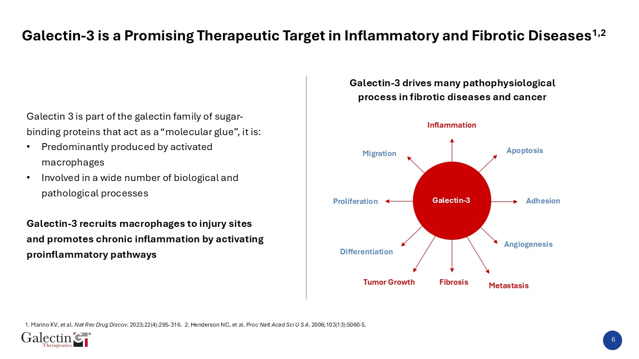 Galectin 3 is part of the galectin family of sugar-binding proteins that act as a “molecular glue”, it is:  Predominantly produced by activated macrophages   Involved in a wide number of biological and pathological processes  Galectin-3 recruits macrophages to injury sites and promotes chronic inflammation by activating proinflammatory pathways  1. Marino KV, et al. Nat Rev Drug Discov. 2023;22(4):295-316. 2. Henderson NC, et al. Proc Natl Acad Sci U S A. 2006;103(13):5060-5.   6  Galectin-3 is a Promising Therapeutic Target in Inflammatory and Fibrotic Diseases1,2   Proliferation  Inflammation  Fibrosis  Apoptosis  Adhesion  Angiogenesis  Metastasis  Tumor Growth  Differentiation  Migration  Galectin-3  Galectin-3 drives many pathophysiological process in fibrotic diseases and cancer