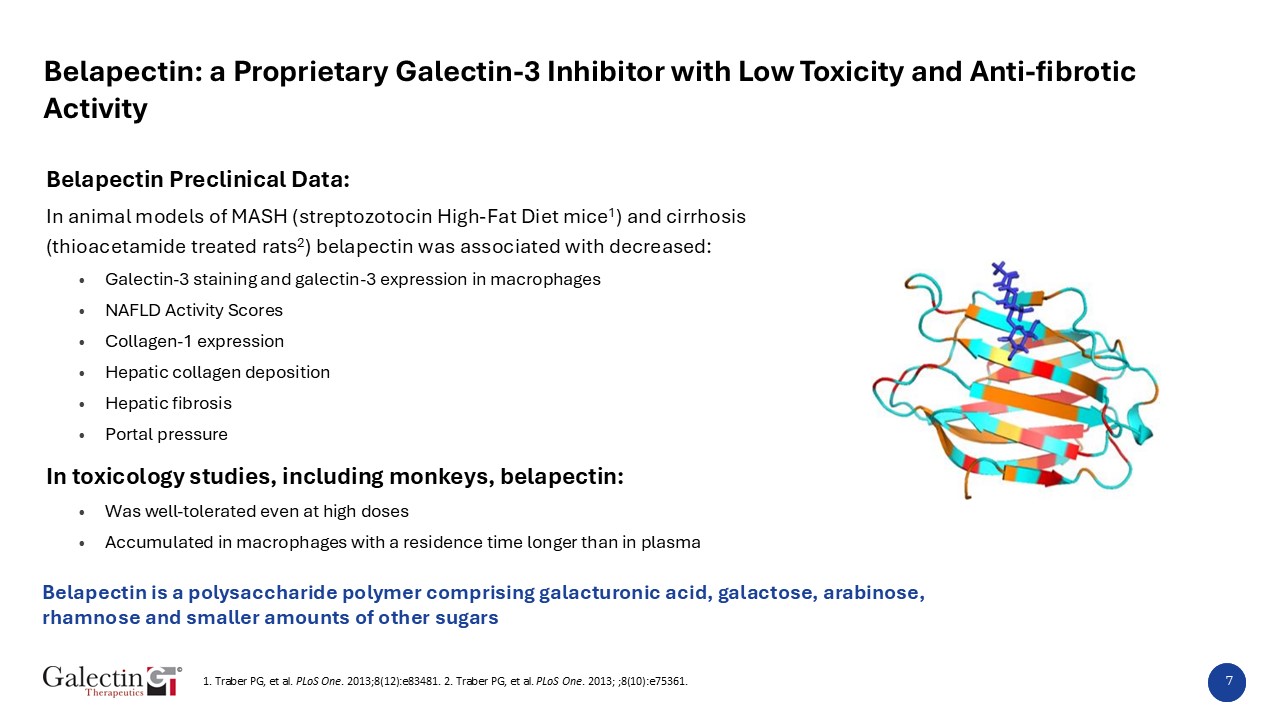 Belapectin is a polysaccharide polymer comprising galacturonic acid, galactose, arabinose, rhamnose and smaller amounts of other sugars  Belapectin Preclinical Data:  In animal models of MASH (streptozotocin High-Fat Diet mice1) and cirrhosis (thioacetamide treated rats2) belapectin was associated with decreased:  Galectin-3 staining and galectin-3 expression in macrophages  NAFLD Activity Scores  Collagen-1 expression  Hepatic collagen deposition  Hepatic fibrosis   Portal pressure  In toxicology studies, including monkeys, belapectin:  Was well-tolerated even at high doses  Accumulated in macrophages with a residence time longer than in plasma  1. Traber PG, et al. PLoS One. 2013;8(12):e83481. 2. Traber PG, et al. PLoS One. 2013; ;8(10):e75361.  7  Belapectin: a Proprietary Galectin-3 Inhibitor with Low Toxicity and Anti-fibrotic Activity
