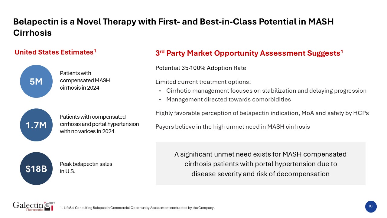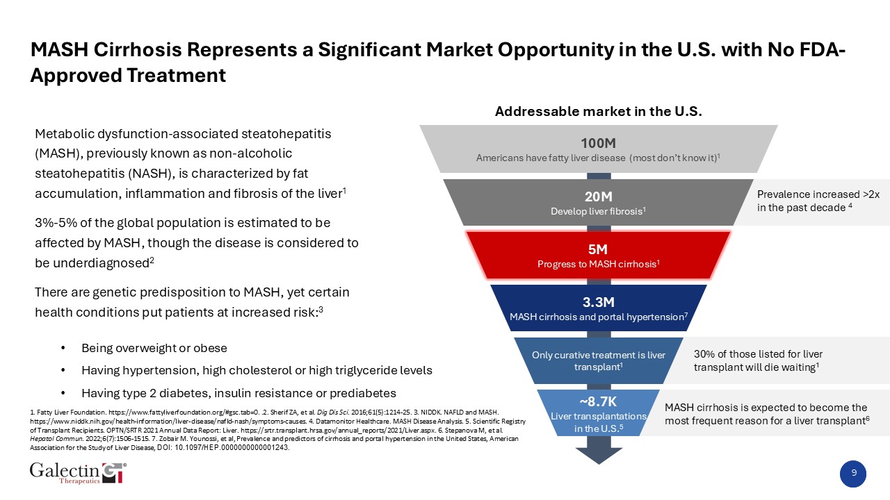 Metabolic dysfunction-associated steatohepatitis (MASH), previously known as non-alcoholic steatohepatitis (NASH), is characterized by fat accumulation, inflammation and fibrosis of the liver1  3%-5% of the global population is estimated to be affected by MASH, though the disease is considered to be underdiagnosed2  There are genetic predisposition to MASH, yet certain health conditions put patients at increased risk:3   1. Fatty Liver Foundation. https://www.fattyliverfoundation.org/#gsc.tab=0. .2. Sherif ZA, et al. Dig Dis Sci. 2016;61(5):1214-25. 3. NIDDK. NAFLD and MASH. https://www.niddk.nih.gov/health-information/liver-disease/nafld-nash/symptoms-causes. 4. Datamonitor Healthcare. MASH Disease Analysis. 5. Scientific Registry of Transplant Recipients. OPTN/SRTR 2021 Annual Data Report: Liver. https://srtr.transplant.hrsa.gov/annual_reports/2021/Liver.aspx. 6. Stepanova M, et al. Hepatol Commun. 2022;6(7):1506-1515. 7. Zobair M. Younossi, et al, Prevalence and predictors of cirrhosis and portal hypertension in the United States, American Association for the Study of Liver Disease, DOI: 10.1097/HEP.0000000000001243.  Being overweight or obese  Having hypertension, high cholesterol or high triglyceride levels  Having type 2 diabetes, insulin resistance or prediabetes  9  MASH Cirrhosis Represents a Significant Market Opportunity in the U.S. with No FDA-Approved Treatment  30% of those listed for liver transplant will die waiting1  MASH cirrhosis is expected to become the most frequent reason for a liver transplant6  Prevalence increased >2x in the past decade 4  Addressable market in the U.S.  ~8.7K  Liver transplantations in the U.S.5   100M   Americans have fatty liver disease (most don’t know it)1  20M   Develop liver fibrosis1  5M   Progress to MASH cirrhosis1  3.3M  MASH cirrhosis and portal hypertension7  Only curative treatment is liver transplant1  ~8.7K  Liver transplantations in the U.S.5