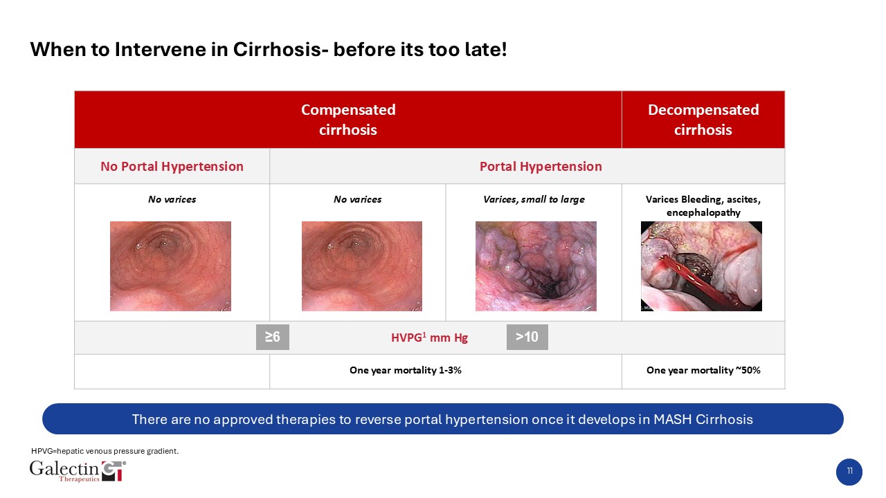HPVG=hepatic venous pressure gradient.   There are no approved therapies to reverse portal hypertension once it develops in MASH Cirrhosis  11  When to Intervene in Cirrhosis- before its too late!  Compensated   cirrhosis  Decompensated cirrhosis  No Portal Hypertension   Portal Hypertension  Stage 2  Stage 3 and 4  No varices  No varices  Varices, small to large  Varices Bleeding, ascites, encephalopathy  HVPG1 mm Hg   One year mortality 1-3%  One year mortality ~50%  ≥6  >10