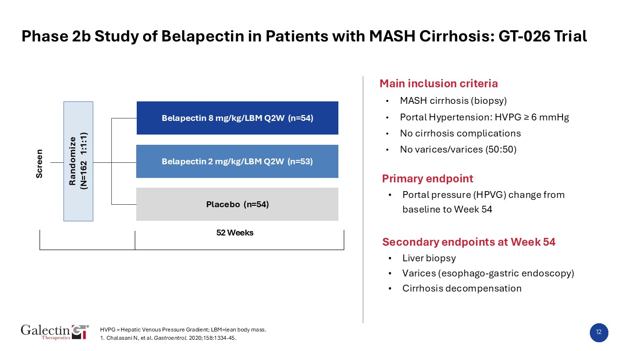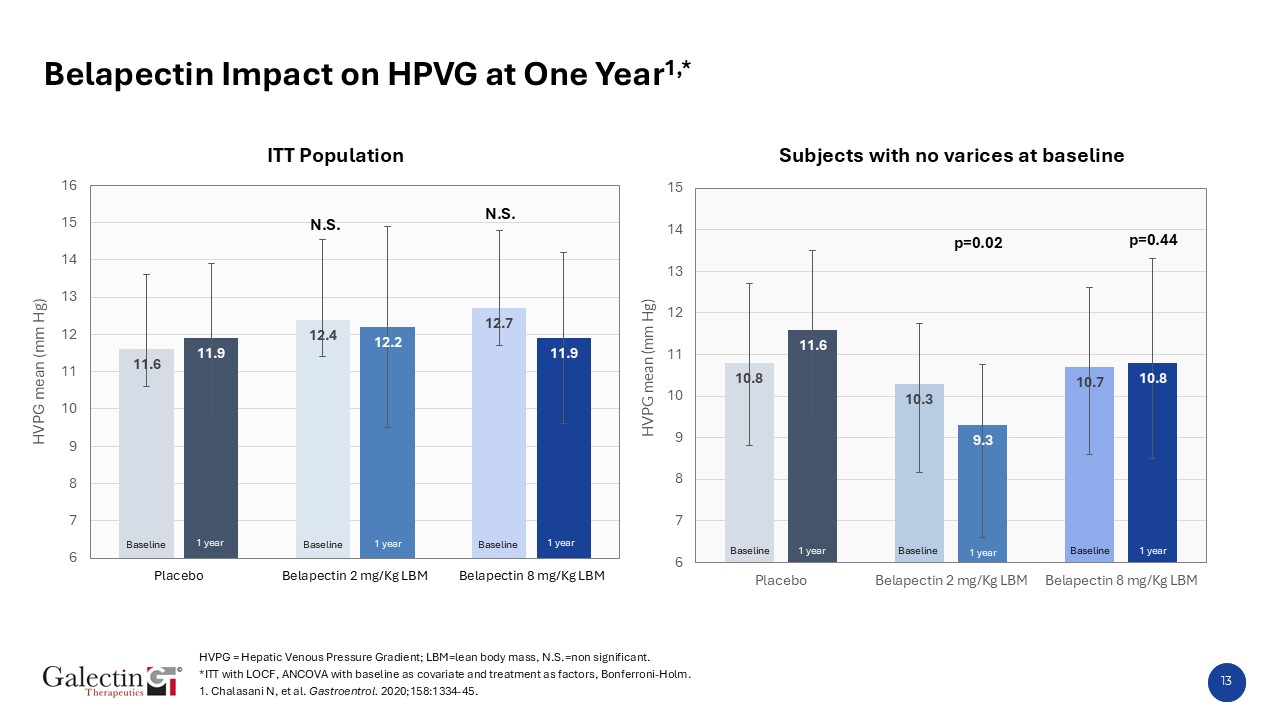 12  Phase 2b Study of Belapectin in Patients with MASH Cirrhosis: GT-026 Trial   Main inclusion criteria  MASH cirrhosis (biopsy)  Portal Hypertension: HVPG ≥ 6 mmHg  No cirrhosis complications  No varices/varices (50:50)  Primary endpoint  Portal pressure (HPVG) change from baseline to Week 54  Secondary endpoints at Week 54  Liver biopsy  Varices (esophago-gastric endoscopy)  Cirrhosis decompensation  Placebo (n=54)  Screen  Belapectin 8 mg/kg/LBM Q2W (n=54)  52 Weeks   Belapectin 2 mg/kg/LBM Q2W (n=53)  Randomize  (N=162 1:1:1)  HVPG = Hepatic Venous Pressure Gradient; LBM=lean body mass. 1. Chalasani N, et al. Gastroentrol. 2020;158:1334-45.