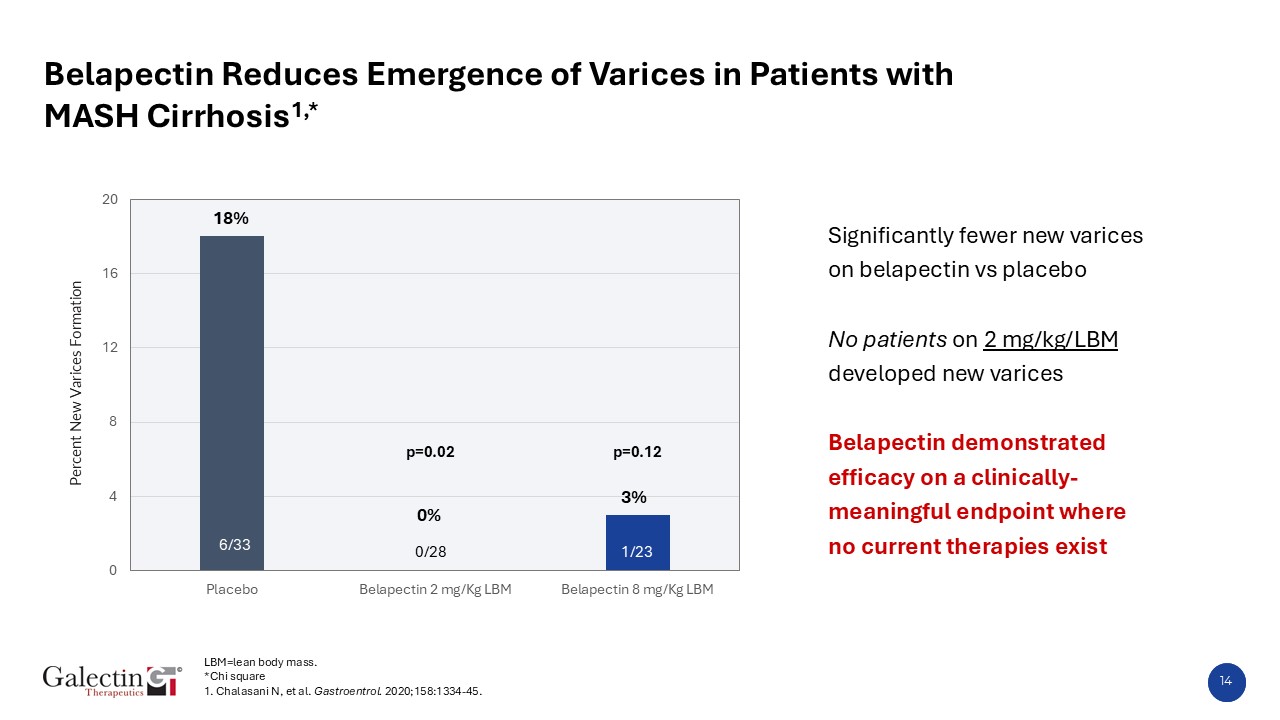 13  Belapectin Impact on HPVG at One Year1,*  HVPG = Hepatic Venous Pressure Gradient; LBM=lean body mass, N.S.=non significant.  *ITT with LOCF, ANCOVA with baseline as covariate and treatment as factors, Bonferroni-Holm.1. Chalasani N, et al. Gastroentrol. 2020;158:1334-45.  N.S.  N.S.  Baseline  1 year  p=0.02  p=0.44  ITT Population  Subjects with no varices at baseline  Baseline  Baseline  1 year  1 year  Baseline  Baseline  Baseline  1 year  1 year  1 year