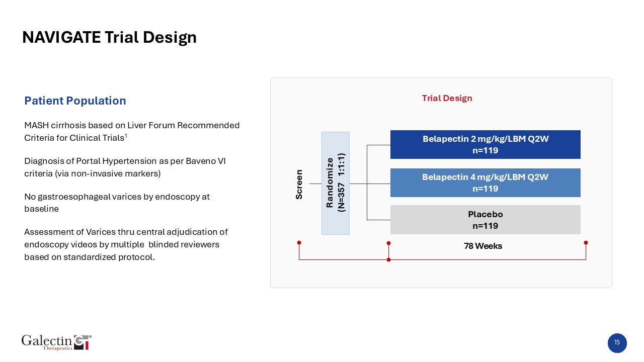14  Belapectin Reduces Emergence of Varices in Patients with MASH Cirrhosis1,*   Significantly fewer new varices on belapectin vs placebo  No patients on 2 mg/kg/LBM developed new varices  Belapectin demonstrated efficacy on a clinically-meaningful endpoint where no current therapies exist  LBM=lean body mass.  *Chi square  1. Chalasani N, et al. Gastroentrol. 2020;158:1334-45.  p=0.02  p=0.12  6/33  1/23