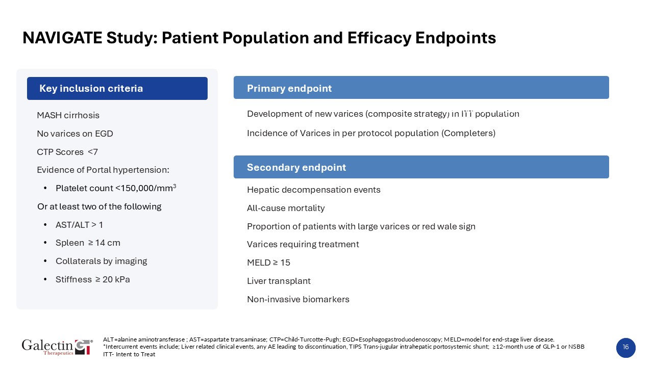 15  NAVIGATE Trial Design  Placebo   n=119  Screen  Belapectin 2 mg/kg/LBM Q2W  n=119  78 Weeks   Belapectin 4 mg/kg/LBM Q2W  n=119  Randomize  (N=357 1:1:1)  Trial Design  Patient Population  MASH cirrhosis based on Liver Forum Recommended Criteria for Clinical Trials1  Diagnosis of Portal Hypertension as per Baveno VI criteria (via non-invasive markers)  No gastroesophageal varices by endoscopy at baseline  Assessment of Varices thru central adjudication of endoscopy videos by multiple blinded reviewers based on standardized protocol.