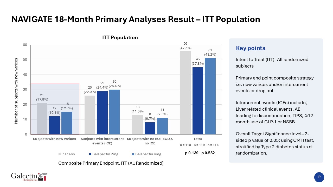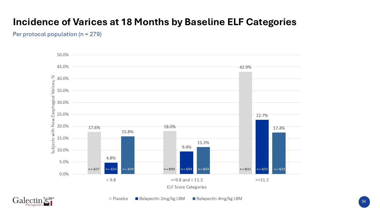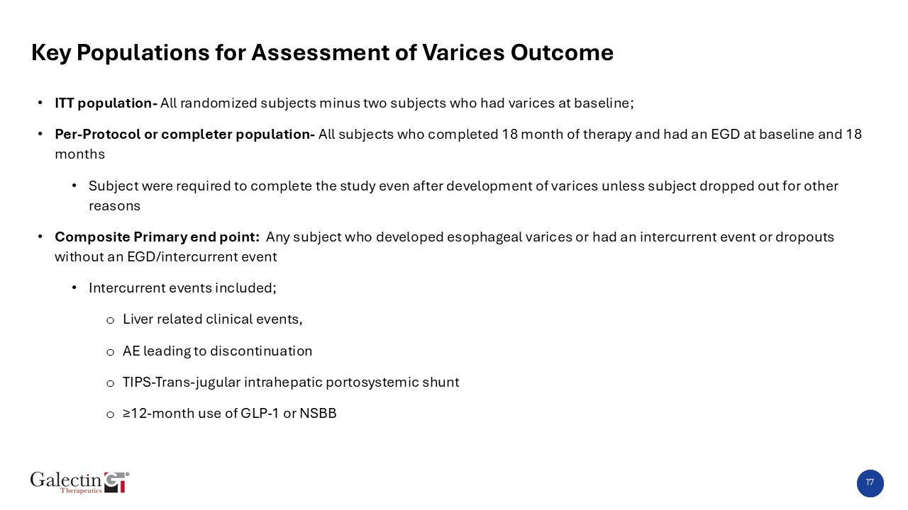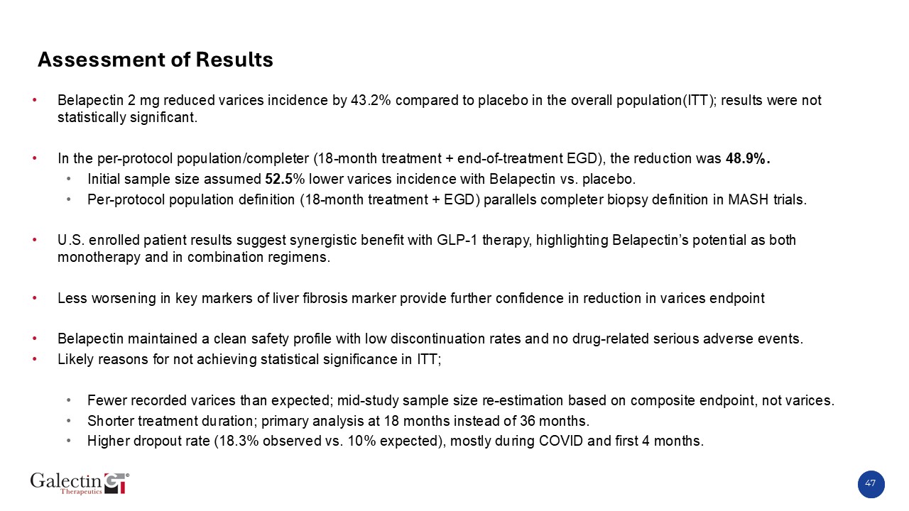 Assessment of Results  Belapectin 2 mg reduced varices incidence by 43.2% compared to placebo in the overall population(ITT); results were not statistically significant.  In the per-protocol population/completer (18-month treatment + end-of-treatment EGD), the reduction was 48.9%.  Initial sample size assumed 52.5% lower varices incidence with Belapectin vs. placebo.  Per-protocol population definition (18-month treatment + EGD) parallels completer biopsy definition in MASH trials.  U.S. enrolled patient results suggest synergistic benefit with GLP-1 therapy, highlighting Belapectin’s potential as both monotherapy and in combination regimens.  Less worsening in key markers of liver fibrosis marker provide further confidence in reduction in varices endpoint  Belapectin maintained a clean safety profile with low discontinuation rates and no drug-related serious adverse events.  Likely reasons for not achieving statistical significance in ITT;  Fewer recorded varices than expected; mid-study sample size re-estimation based on composite endpoint, not varices.  Shorter treatment duration; primary analysis at 18 months instead of 36 months.  Higher dropout rate (18.3% observed vs. 10% expected), mostly during COVID and first 4 months.  47