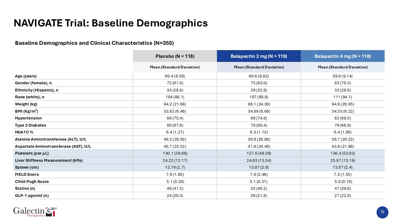 18  NAVIGATE Trial: Baseline Demographics   Baseline Demographics and Clinical Characteristics (N=355)     Placebo (N = 118)  Belapectin 2 mg (N = 119)  Belapectin 4 mg (N = 118)     Mean (Standard Deviation)  Mean (Standard Deviation)  Mean (Standard Deviation)  Age (years)  60.4 (8.50)  60.6 (8.82)  59.0 (9.14)  Gender (female), n  72 (61.0)  75 (63.0)  83 (70.3)  Ethnicity (Hispanic), n  34 (28.8)  39 (32.8)  33 (28.0)  Race (white), n  104 (88.1)  107 (89.9)  111 (94.1)  Weight (kg)  94.2 (21.68)  98.1 (24.30)  94.6 (20.95)  BMI (Kg/m2)  33.82 (6.46)  34.88 (6.68)  34.53 (6.22)  Hypertension  89 (75.4)  89 (74.8)  82 (69.5)  Type 2 Diabetes  80 (67.8)  79 (66.4)  79 (66.9)  HbA1C %  6.4 (1.27)  6.3 (1.13)  6.4 (1.09)  Alanine Aminotransferase (ALT), U/L  46.3 (29.92)  38.9 (26.88)  39.7 (20.22)  Aspartate Aminotransferase (AST), U/L  46.7 (23.52)  41.8 (24.40)  43.6 (21.90)  Platelets (per µL)  130.1 (39.66)  127.6 (48.39)  136.4 (53.62)  Liver Stiffness Measurement (kPa)  24.22 (12.17)  24.63 (13.54)  25.67 (13.19)  Spleen (cm)  13.79 (2.7)  13.97 (2.6)  13.87 (2.4)  MELD Score  7.6 (1.65)  7.9 (2.46)  7.5 (1.55)  Child Pugh Score   5.1 (0.29)  5.1 (0.31)    5.0 (0.18)  Statins (n)  49 (41.5)  55 (46.2)  47 (39.8)  GLP-1 agonist (n)  24 (20.3)  26 (21.8)  27 (22.9)