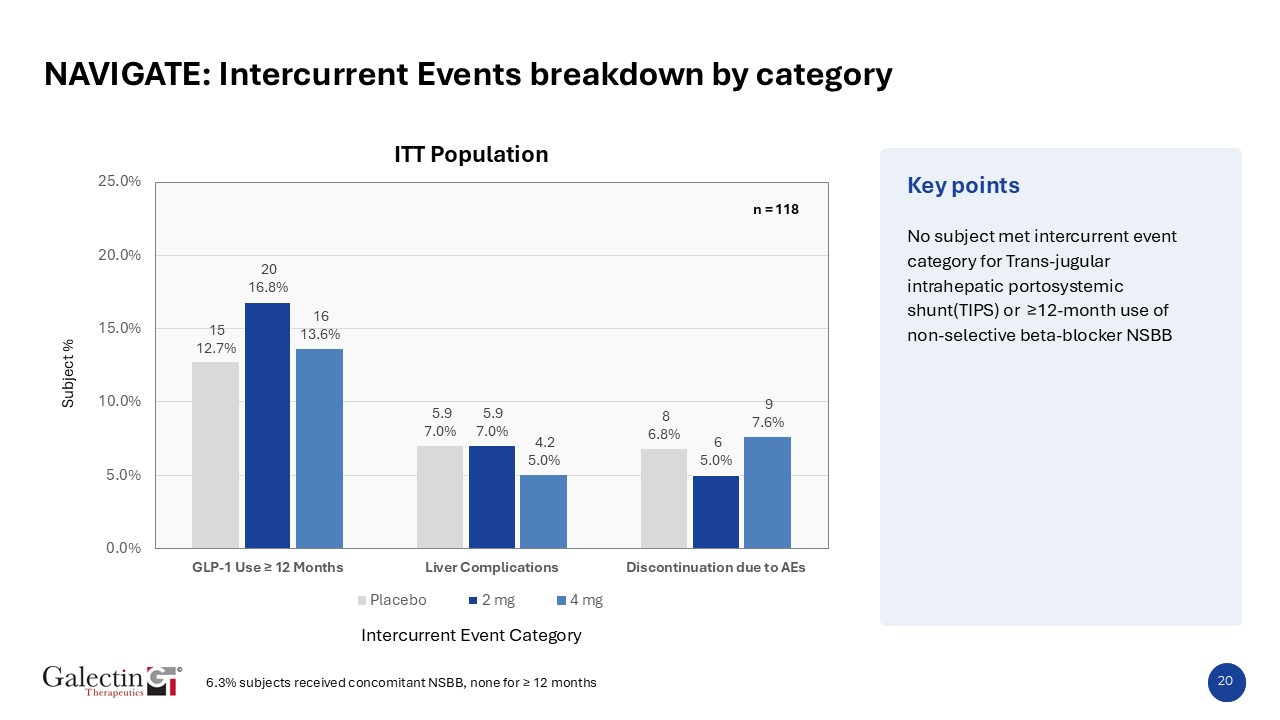 Key points  20  NAVIGATE: Intercurrent Events breakdown by category  n = 118   Subject %  Intercurrent Event Category  No subject met intercurrent event category for Trans-jugular intrahepatic portosystemic shunt(TIPS) or ≥12-month use of non-selective beta-blocker NSBB  ITT Population  6.3% subjects received concomitant NSBB, none for ≥ 12 months