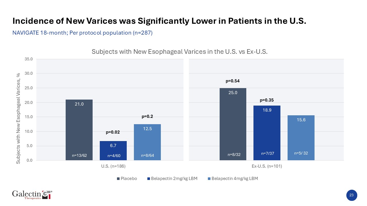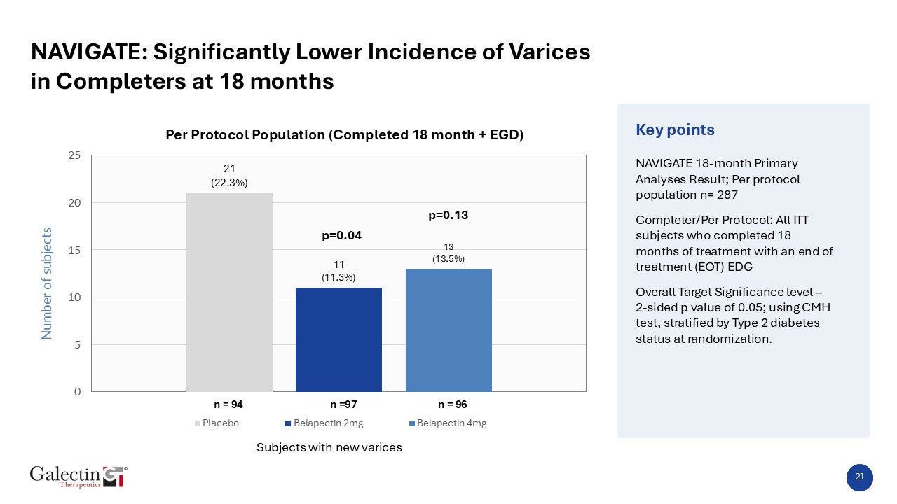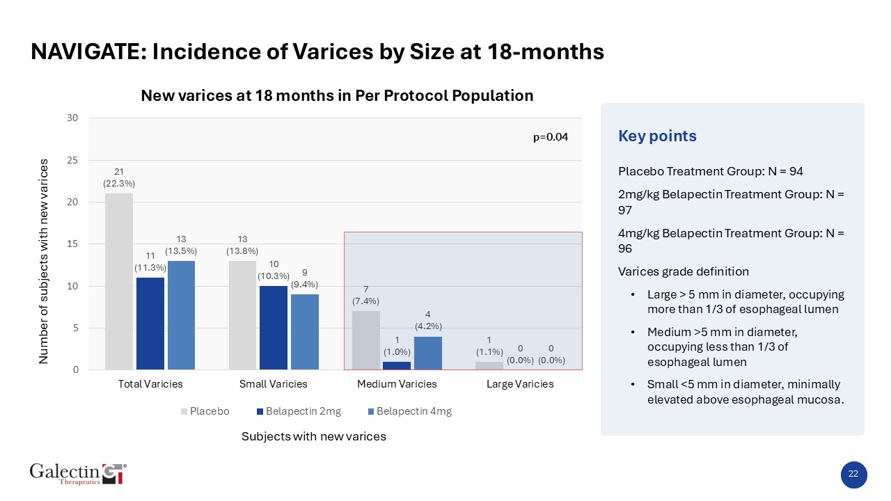 Key points  NAVIGATE: Incidence of Varices by Size at 18-months  Number of subjects with new varices  Subjects with new varices  New varices at 18 months in Per Protocol Population   Placebo Treatment Group: N = 94  2mg/kg Belapectin Treatment Group: N = 97  4mg/kg Belapectin Treatment Group: N = 96  Varices grade definition  Large > 5 mm in diameter, occupying more than 1/3 of esophageal lumen  Medium >5 mm in diameter, occupying less than 1/3 of esophageal lumen  Small <5 mm in diameter, minimally elevated above esophageal mucosa.  p=0.04  22