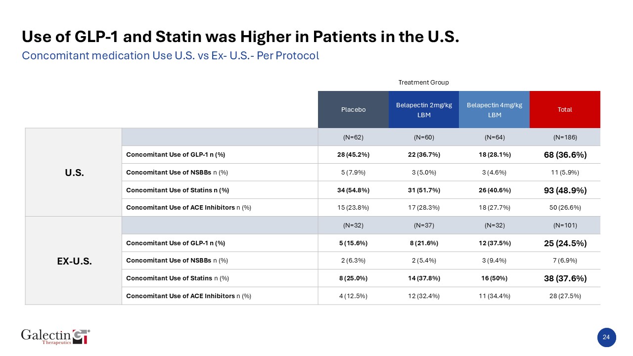 24  Use of GLP-1 and Statin was Higher in Patients in the U.S.  24     Treatment Group        Placebo  Belapectin 2mg/kg LBM  Belapectin 4mg/kg LBM  Total  U.S.     (N=62)  (N=60)  (N=64)  (N=186)  Concomitant Use of GLP-1 n (%)  28 (45.2%)  22 (36.7%)  18 (28.1%)  68 (36.6%)  Concomitant Use of NSBBs n (%)  5 (7.9%)  3 (5.0%)  3 (4.6%)  11 (5.9%)  Concomitant Use of Statins n (%)  34 (54.8%)  31 (51.7%)  26 (40.6%)  93 (48.9%)  Concomitant Use of ACE Inhibitors n (%)  15 (23.8%)  17 (28.3%)  18 (27.7%)  50 (26.6%)  EX-U.S.     (N=32)  (N=37)  (N=32)  (N=101)  Concomitant Use of GLP-1 n (%)  5 (15.6%)  8 (21.6%)  12 (37.5%)  25 (24.5%)  Concomitant Use of NSBBs n (%)  2 (6.3%)  2 (5.4%)  3 (9.4%)  7 (6.9%)  Concomitant Use of Statins n (%)  8 (25.0%)  14 (37.8%)  16 (50%)  38 (37.6%)  Concomitant Use of ACE Inhibitors n (%)  4 (12.5%)  12 (32.4%)  11 (34.4%)  28 (27.5%)  Concomitant medication Use U.S. vs Ex- U.S.- Per Protocol