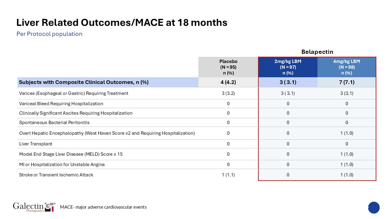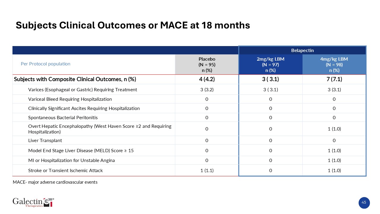 Subjects Clinical Outcomes or MACE at 18 months  Per Protocol population        Belapectin  Placebo  (N = 95)  n (%)  2mg/kg LBM  (N = 97)  n (%)  4mg/kg LBM  (N = 98)  n (%)  Subjects with Composite Clinical Outcomes, n (%)  4 (4.2)  3 ( 3.1)  7 (7.1)  Varices (Esophageal or Gastric) Requiring Treatment  3 (3.2)  3 ( 3.1)  3 (3.1)  Variceal Bleed Requiring Hospitalization  0  0  0  Clinically Significant Ascites Requiring Hospitalization  0  0  0  Spontaneous Bacterial Peritonitis  0  0  0  Overt Hepatic Encephalopathy (West Haven Score ≥2 and Requiring Hospitalization)  0  0  1 (1.0)  Liver Transplant  0  0  0  Model End Stage Liver Disease (MELD) Score ≥ 15  0  0  1 (1.0)  MI or Hospitalization for Unstable Angina  0  0  1 (1.0)  Stroke or Transient Ischemic Attack   1 (1.1)  0  1 (1.0)  MACE- major adverse cardiovascular events  45