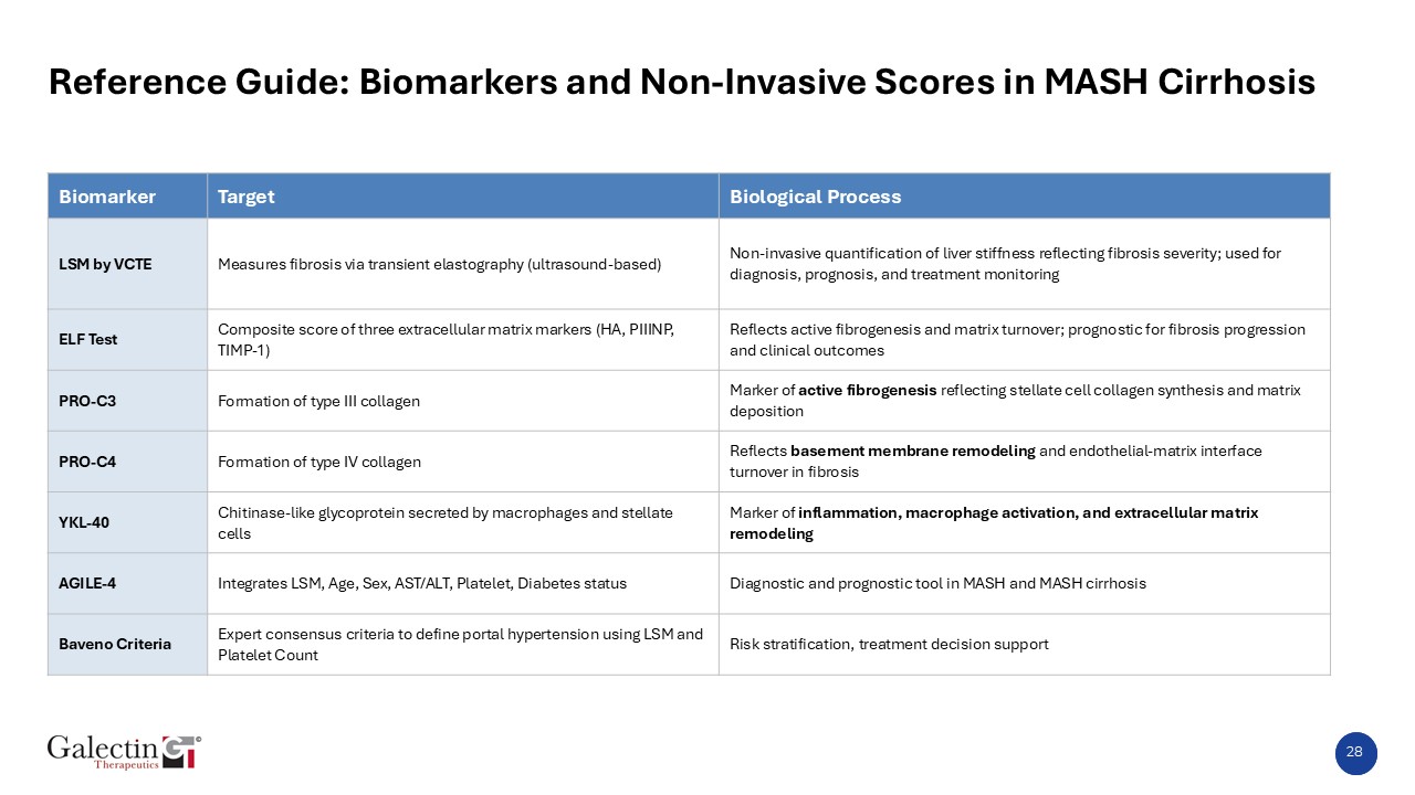 28  Reference Guide: Biomarkers and Non-Invasive Scores in MASH Cirrhosis  Biomarker  Target  Biological Process  LSM by VCTE  Measures fibrosis via transient elastography (ultrasound-based)  Non-invasive quantification of liver stiffness reflecting fibrosis severity; used for diagnosis, prognosis, and treatment monitoring  ELF Test  Composite score of three extracellular matrix markers (HA, PIIINP, TIMP-1)  Reflects active fibrogenesis and matrix turnover; prognostic for fibrosis progression and clinical outcomes  PRO-C3  Formation of type III collagen  Marker of active fibrogenesis reflecting stellate cell collagen synthesis and matrix deposition  PRO-C4  Formation of type IV collagen  Reflects basement membrane remodeling and endothelial-matrix interface turnover in fibrosis  YKL-40  Chitinase-like glycoprotein secreted by macrophages and stellate cells  Marker of inflammation, macrophage activation, and extracellular matrix remodeling  AGILE-4  Integrates LSM, Age, Sex, AST/ALT, Platelet, Diabetes status   Diagnostic and prognostic tool in MASH and MASH cirrhosis  Baveno Criteria  Expert consensus criteria to define portal hypertension using LSM and Platelet Count  Risk stratification, treatment decision support