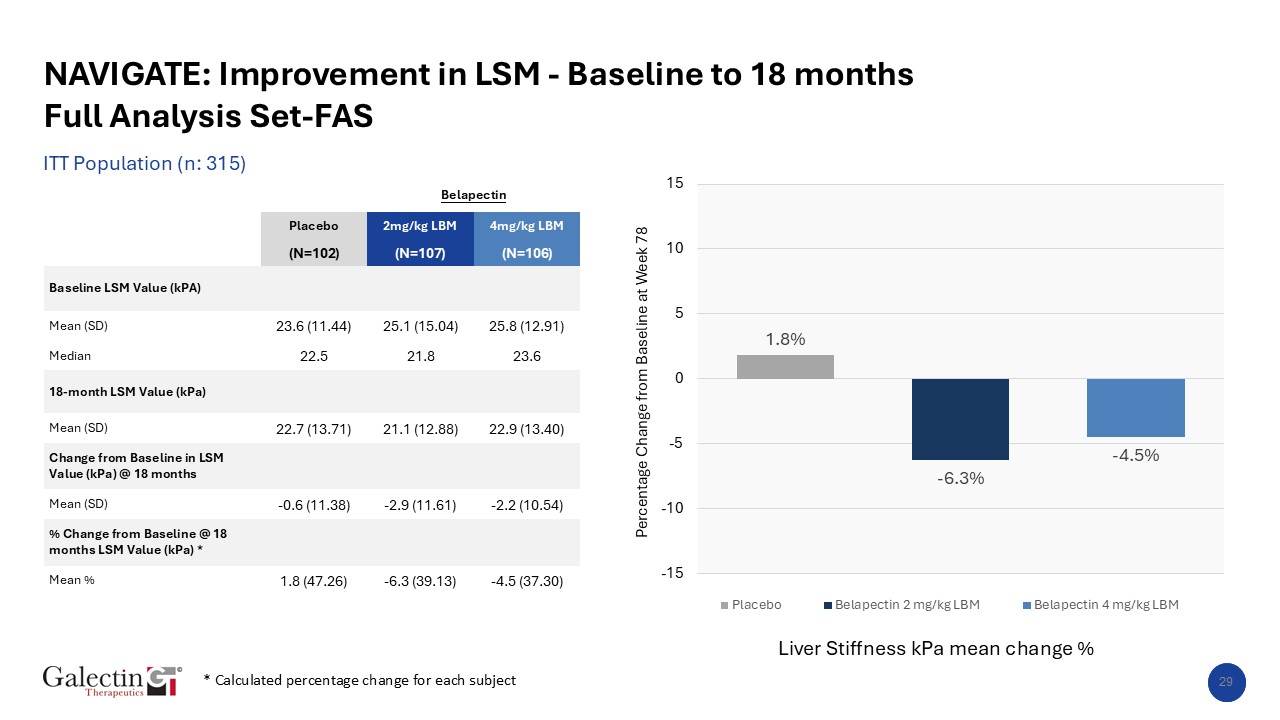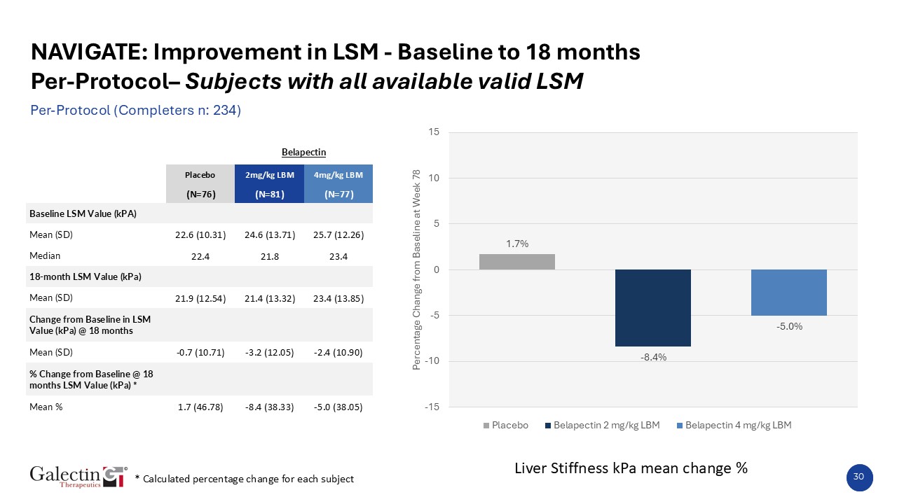NAVIGATE: Improvement in LSM - Baseline to 18 monthsPer-Protocol– Subjects with all available valid LSM  Per-Protocol (Completers n: 234)  N=97  N=96  Liver Stiffness kPa mean change %   Belapectin  Placebo  2mg/kg LBM  4mg/kg LBM  (N=76)  (N=81)  (N=77)  Baseline LSM Value (kPA)           Mean (SD)  22.6 (10.31)  24.6 (13.71)  25.7 (12.26)  Median  22.4  21.8  23.4  18-month LSM Value (kPa)           Mean (SD)  21.9 (12.54)  21.4 (13.32)  23.4 (13.85)  Change from Baseline in LSM Value (kPa) @ 18 months           Mean (SD)  -0.7 (10.71)  -3.2 (12.05)  -2.4 (10.90)  % Change from Baseline @ 18 months LSM Value (kPa) *           Mean %  1.7 (46.78)  -8.4 (38.33)  -5.0 (38.05)  * Calculated percentage change for each subject  30
