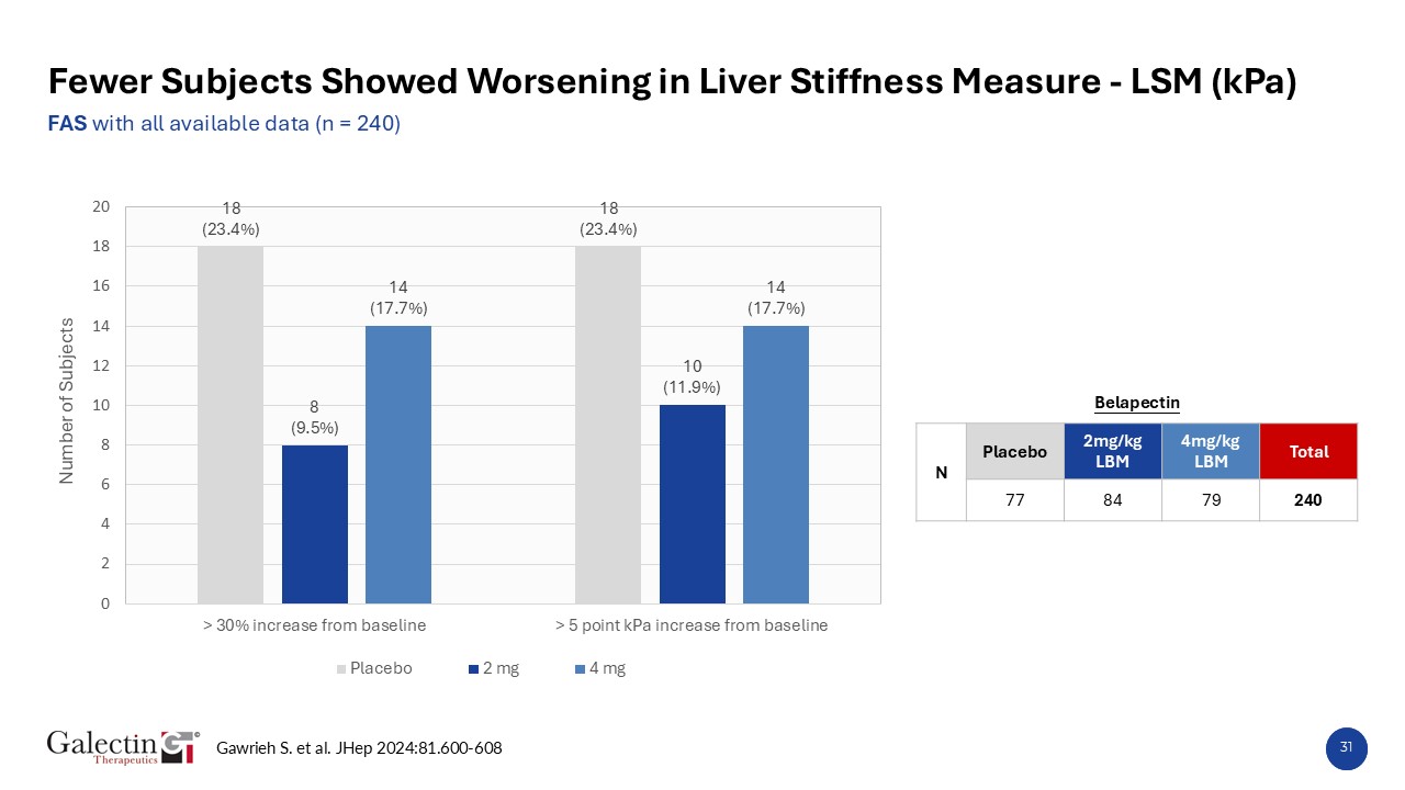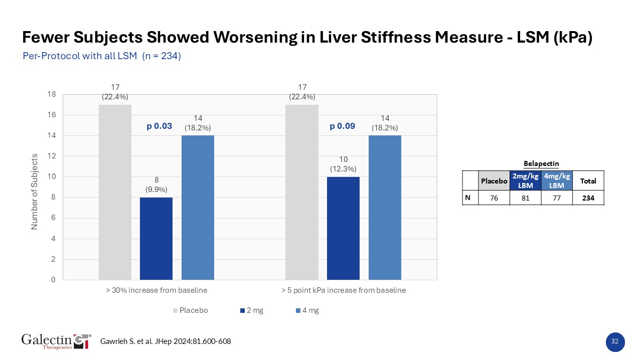 Gawrieh S. et al. JHep 2024:81.600-608  Belapectin  N  Placebo  2mg/kg LBM  4mg/kg LBM  Total  77  84  79  240  31  Fewer Subjects Showed Worsening in Liver Stiffness Measure - LSM (kPa)   FAS with all available data (n = 240)