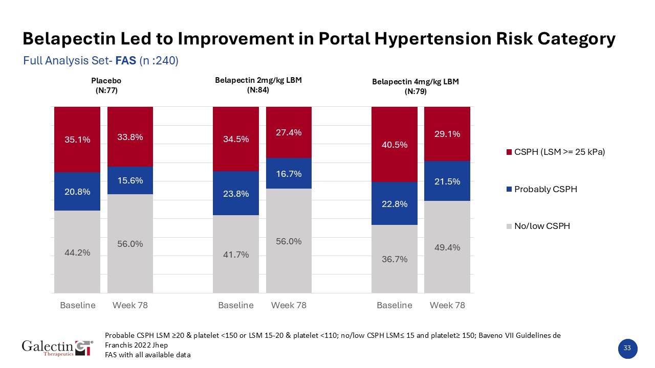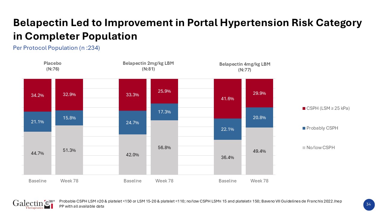 33  Belapectin Led to Improvement in Portal Hypertension Risk Category  Full Analysis Set- FAS (n :240)  Probable CSPH LSM ≥20 & platelet <150 or LSM 15-20 & platelet <110; no/low CSPH LSM≤ 15 and platelet≥ 150; Baveno VII Guidelines de Franchis 2022 Jhep  FAS with all available data   Belapectin 2mg/kg LBM  (N:84)  Placebo  (N:77)  Belapectin 4mg/kg LBM  (N:79)