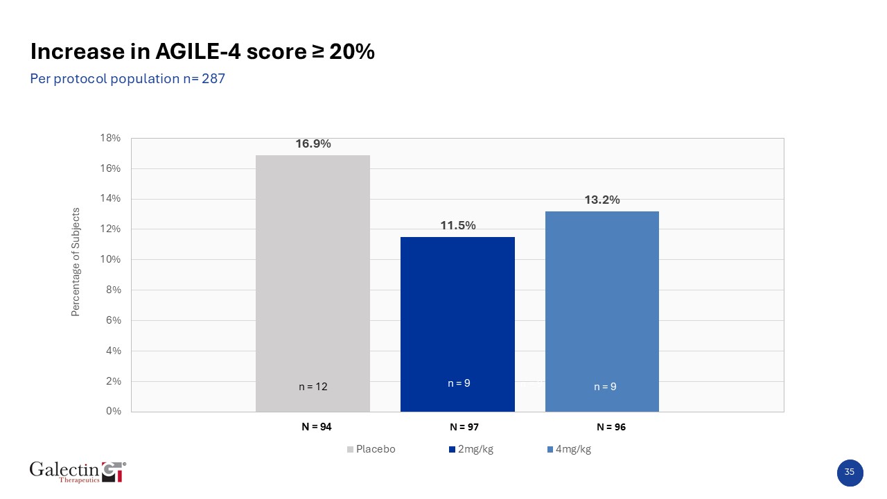 35  Increase in AGILE-4 score ≥ 20%  Per protocol population n= 287  N = 95  n = 12  n = 9  n = 9  N = 94  N = 97  N = 96  n = 9