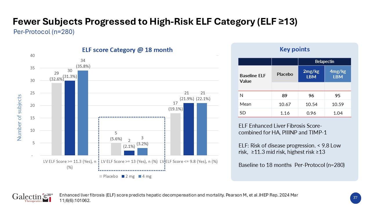 Key points  37  Fewer Subjects Progressed to High-Risk ELF Category (ELF ≥13)  ELF Enhanced Liver Fibrosis Score- combined for HA, PIIINP and TIMP-1  ELF: Risk of disease progression. < 9.8 Low risk, ≥11.3 mid risk, highest risk ≥13   Baseline to 18 months Per-Protocol (n=280)  Belapectin  Baseline ELF Value  Placebo  2mg/kg LBM  4mg/kg LBM           N  89  96  95  Mean  10.67  10.54  10.59  SD  1.16  0.96  1.04  Number of subjects  ELF score Category @ 18 month  Enhanced liver fibrosis (ELF) score predicts hepatic decompensation and mortality. Pearson M, et al JHEP Rep. 2024 Mar 11;6(6):101062.   Per-Protocol (n=280)