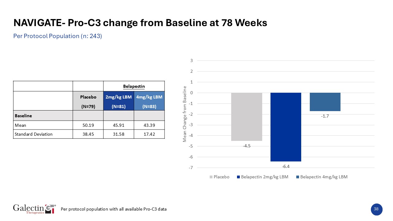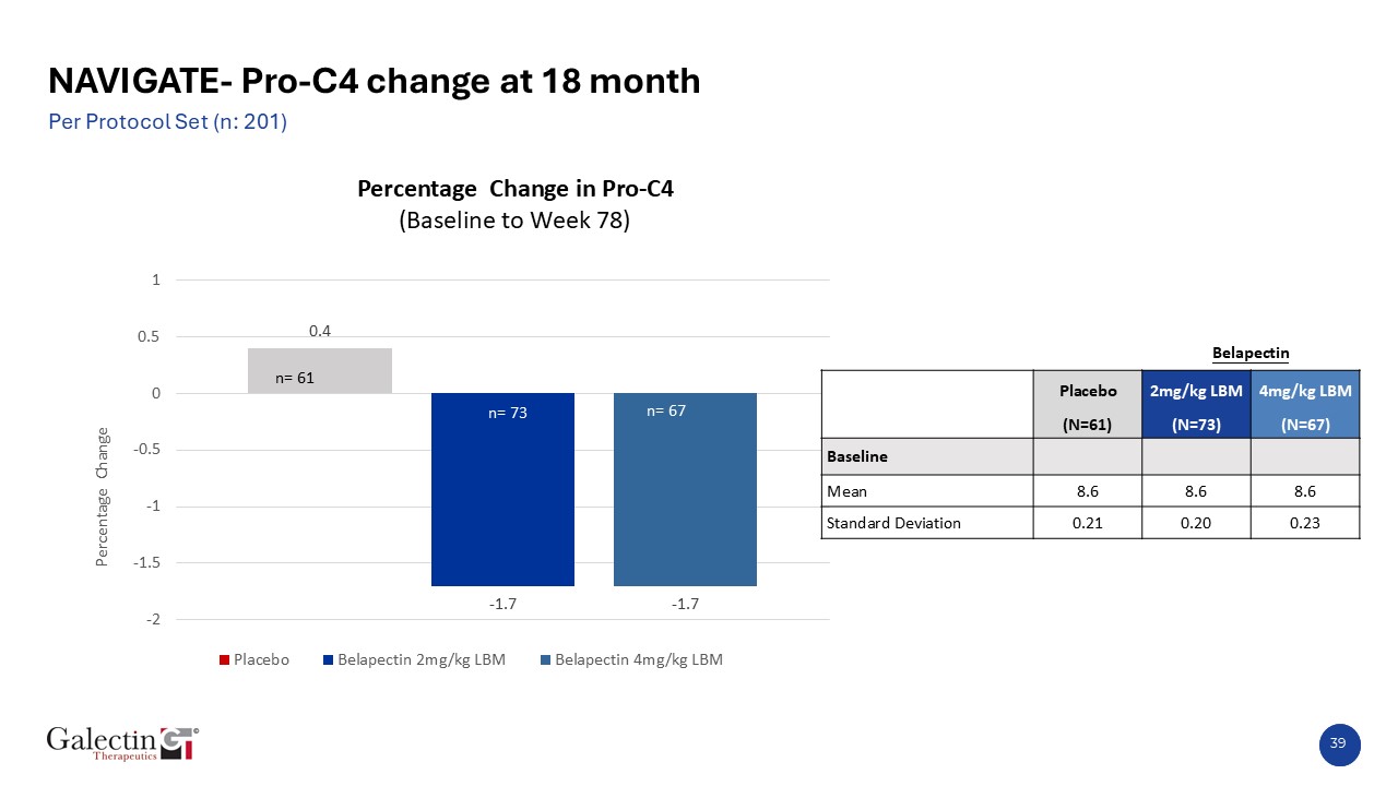 38  NAVIGATE- Pro-C3 change from Baseline at 78 Weeks  Per Protocol Population (n: 243)  Belapectin  Placebo  2mg/kg LBM  4mg/kg LBM  (N=79)  (N=81)  (N=83)  Baseline  Mean  50.19  45.91  43.39  Standard Deviation  38.45  31.58  17.42  Per protocol population with all available Pro-C3 data
