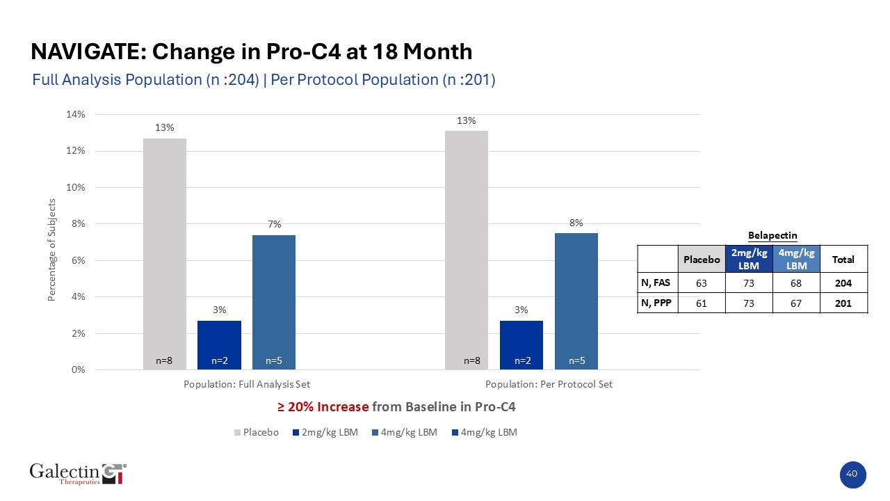 40  NAVIGATE: Change in Pro-C4 at 18 Month  Full Analysis Population (n :204) | Per Protocol Population (n :201)  n=8  n=2  n=5  n=8  n=2  n=5  Belapectin  Placebo  2mg/kg LBM  4mg/kg LBM  Total  N, FAS  63  73  68  204  N, PPP  61  73  67  201