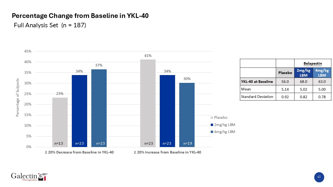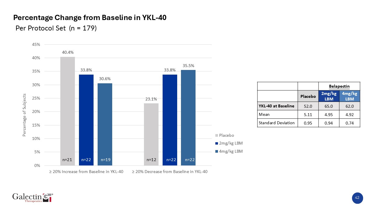 Percentage Change from Baseline in YKL-40  Full Analysis Set (n = 187)  n=13  n=23  n=23  n=23  n=23  n=19  Belapectin  Placebo  2mg/kg LBM  4mg/kg LBM  YKL-40 at Baseline  56.0  68.0  63.0  Mean  5.14  5.02  5.00  Standard Deviation  0.92  0.82  0.78  41