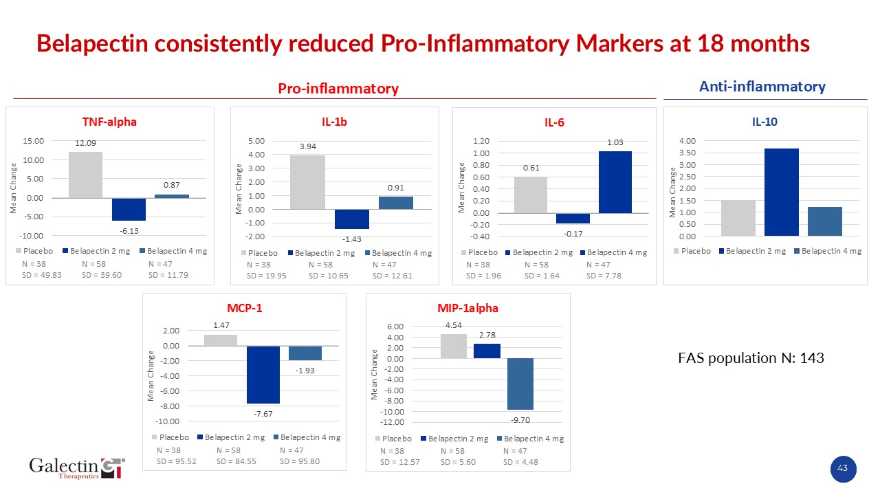 Belapectin consistently reduced Pro-Inflammatory Markers at 18 months   FAS population N: 143  N = 38  SD = 19.95  N = 58  SD = 10.65  N = 47  SD = 12.61  N = 38  SD = 95.52  N = 58  SD = 84.55  N = 47  SD = 95.80  N = 38  SD = 49.83  N = 58  SD = 39.60  N = 47  SD = 11.79  N = 38  SD = 1.96  N = 58  SD = 1.64  N = 47  SD = 7.78  N = 38  SD = 12.57  N = 58  SD = 5.60  N = 47  SD = 4.48  43  Pro-inflammatory  Anti-inflammatory