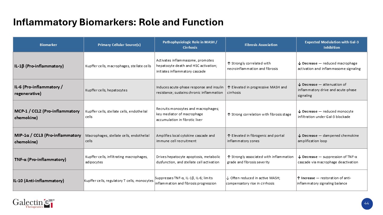 44  Inflammatory Biomarkers: Role and Function   Biomarker   Primary Cellular Source(s)  Pathophysiologic Role in MASH / Cirrhosis  Fibrosis Association  Expected Modulation with Gal-3 Inhibition  IL-1β (Pro-inflammatory)  Kupffer cells, macrophages, stellate cells  Activates inflammasome, promotes hepatocyte death and HSC activation; initiates inflammatory cascade  ↑ Strongly correlated with necroinflammation and fibrosis  ↓ Decrease — reduced macrophage activation and inflammasome signaling  IL-6 (Pro-inflammatory / regenerative)  Kupffer cells, hepatocytes  Induces acute-phase response and insulin resistance; sustains chronic inflammation  ↑ Elevated in progressive MASH and cirrhosis  ↓ Decrease — attenuation of inflammatory drive and acute-phase signaling  MCP-1 / CCL2 (Pro-inflammatory chemokine)  Kupffer cells, stellate cells, endothelial cells  Recruits monocytes and macrophages; key mediator of macrophage accumulation in fibrotic liver  ↑ Strong correlation with fibrosis stage  ↓ Decrease — reduced monocyte infiltration under Gal-3 blockade  MIP-1α / CCL3 (Pro-inflammatory chemokine)  Macrophages, stellate cells, endothelial cells  Amplifies local cytokine cascade and immune cell recruitment  ↑ Elevated in fibrogenic and portal inflammatory zones  ↓ Decrease — dampened chemokine amplification loop  TNF-α (Pro-inflammatory)  Kupffer cells, infiltrating macrophages, adipocytes  Drives hepatocyte apoptosis, metabolic dysfunction, and stellate cell activation  ↑ Strongly associated with inflammation grade and fibrosis severity  ↓ Decrease — suppression of TNF-α cascade via macrophage deactivation  IL-10 (Anti-inflammatory)  Kupffer cells, regulatory T cells, monocytes  Suppresses TNF-α, IL-1β, IL-6; limits inflammation and fibrosis progression  ↓ Often reduced in active MASH; compensatory rise in cirrhosis  ↑ Increase — restoration of anti-inflammatory signaling balance
