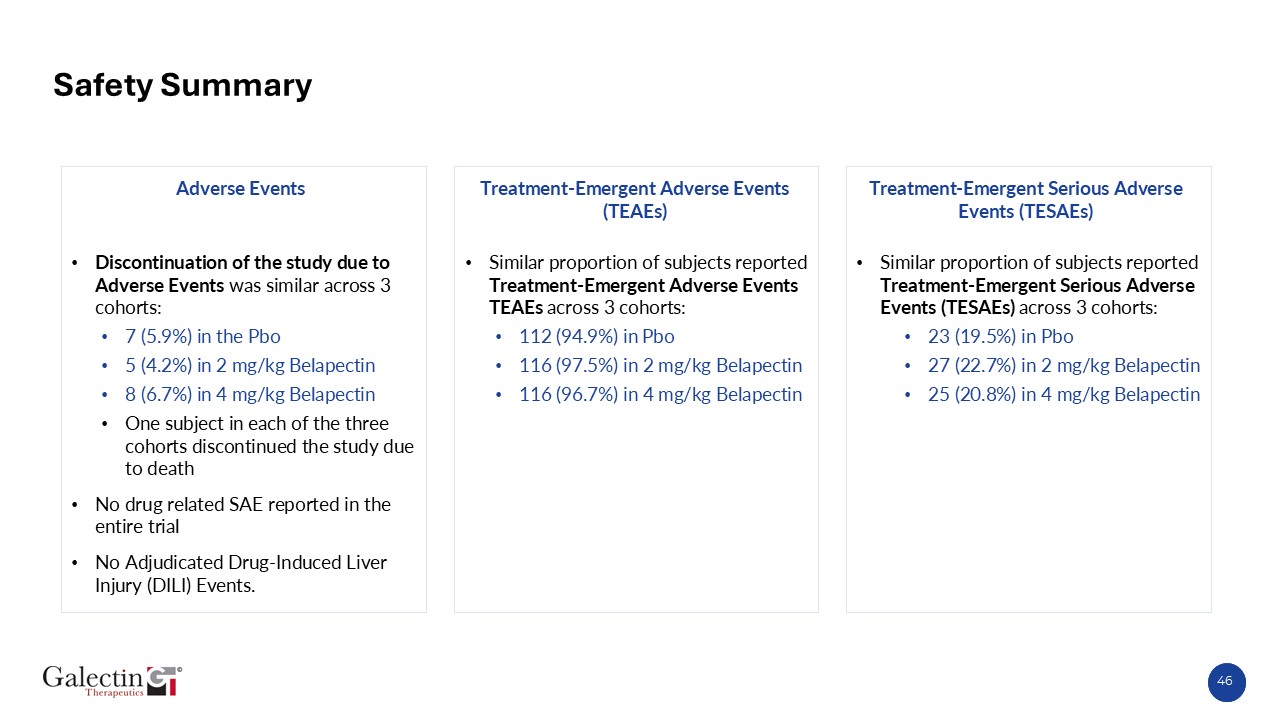 Safety Summary  Discontinuation of the study due to Adverse Events was similar across 3 cohorts:  7 (5.9%) in the Pbo  5 (4.2%) in 2 mg/kg Belapectin  8 (6.7%) in 4 mg/kg Belapectin  One subject in each of the three cohorts discontinued the study due to death  No drug related SAE reported in the entire trial  No Adjudicated Drug-Induced Liver Injury (DILI) Events.  Similar proportion of subjects reported Treatment-Emergent Adverse Events TEAEs across 3 cohorts:  112 (94.9%) in Pbo  116 (97.5%) in 2 mg/kg Belapectin   116 (96.7%) in 4 mg/kg Belapectin  Similar proportion of subjects reported Treatment-Emergent Serious Adverse Events (TESAEs) across 3 cohorts:  23 (19.5%) in Pbo  27 (22.7%) in 2 mg/kg Belapectin   25 (20.8%) in 4 mg/kg Belapectin  Adverse Events  Treatment-Emergent Adverse Events (TEAEs)  Treatment-Emergent Serious Adverse Events (TESAEs)  46