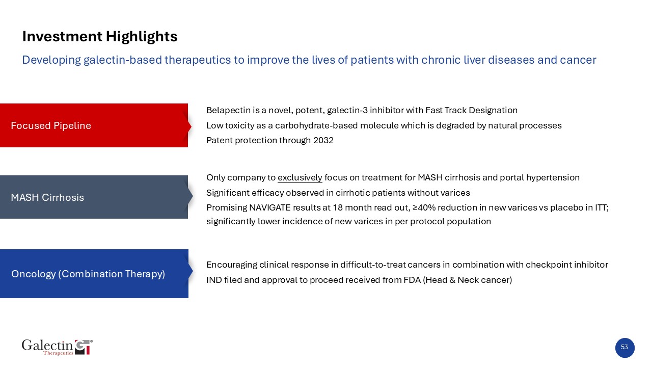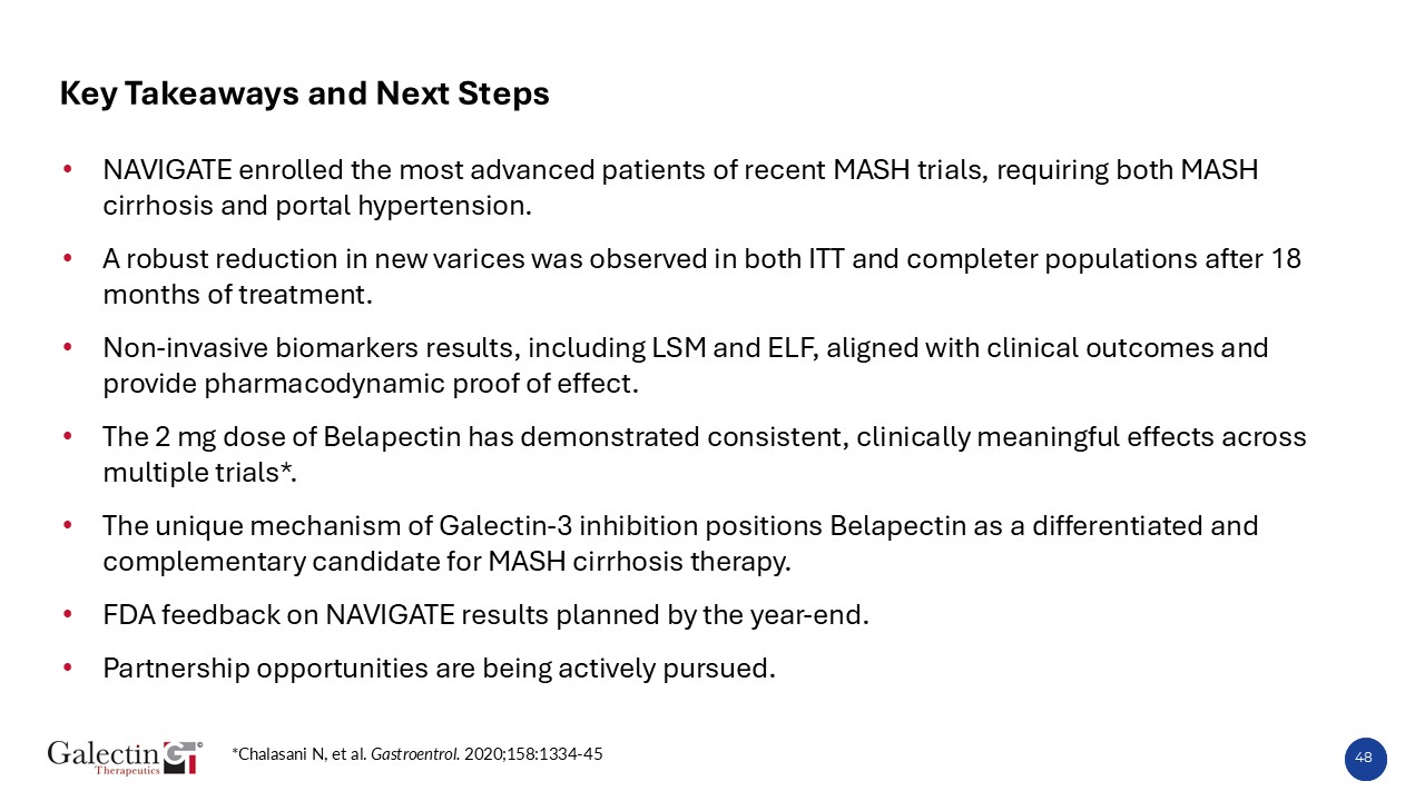 Key Takeaways and Next Steps   NAVIGATE enrolled the most advanced patients of recent MASH trials, requiring both MASH cirrhosis and portal hypertension.  A robust reduction in new varices was observed in both ITT and completer populations after 18 months of treatment.  Non-invasive biomarkers results, including LSM and ELF, aligned with clinical outcomes and provide pharmacodynamic proof of effect.  The 2 mg dose of Belapectin has demonstrated consistent, clinically meaningful effects across multiple trials*.  The unique mechanism of Galectin-3 inhibition positions Belapectin as a differentiated and complementary candidate for MASH cirrhosis therapy.  FDA feedback on NAVIGATE results planned by the year-end.  Partnership opportunities are being actively pursued.  *Chalasani N, et al. Gastroentrol. 2020;158:1334-45  48