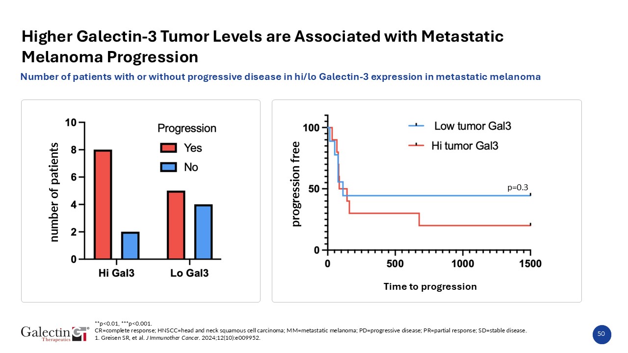 50  Higher Galectin-3 Tumor Levels are Associated with Metastatic Melanoma Progression  **p<0.01, ***p<0.001.  CR=complete response; HNSCC=head and neck squamous cell carcinoma; MM=metastatic melanoma; PD=progressive disease; PR=partial response; SD=stable disease.  1. Greisen SR, et al. J Immunother Cancer. 2024;12(10):e009952.  Number of patients with or without progressive disease in hi/lo Galectin-3 expression in metastatic melanoma  number of patients  p=0.3  progression free  Time to progression