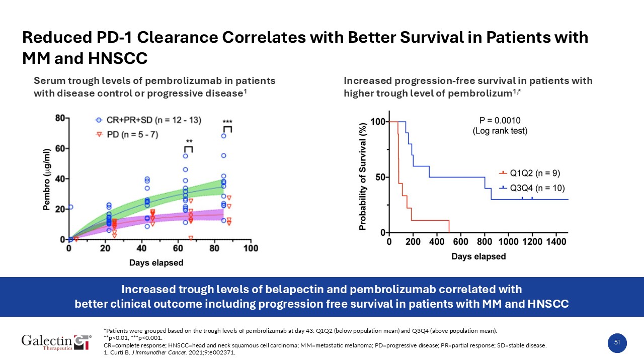 Increased progression-free survival in patients with higher trough level of pembrolizum1,*  51  Reduced PD-1 Clearance Correlates with Better Survival in Patients with MM and HNSCC  Serum trough levels of pembrolizumab in patients with disease control or progressive disease1  Increased trough levels of belapectin and pembrolizumab correlated with better clinical outcome including progression free survival in patients with MM and HNSCC  *Patients were grouped based on the trough levels of pembrolizumab at day 43: Q1Q2 (below population mean) and Q3Q4 (above population mean).  **p<0.01, ***p<0.001.  CR=complete response; HNSCC=head and neck squamous cell carcinoma; MM=metastatic melanoma; PD=progressive disease; PR=partial response; SD=stable disease.  1. Curti B. J Immunother Cancer. 2021;9:e002371.