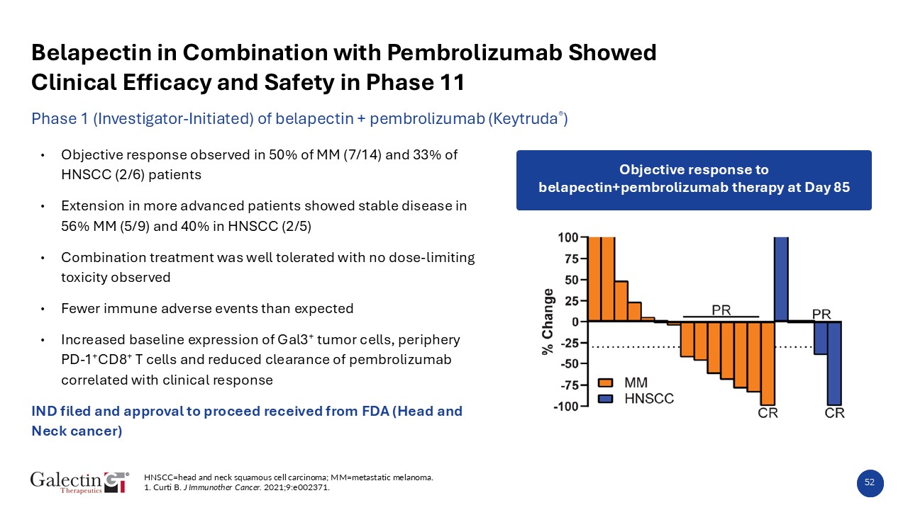 Phase 1 (Investigator-Initiated) of belapectin + pembrolizumab (Keytruda®)  52  Belapectin in Combination with Pembrolizumab Showed Clinical Efficacy and Safety in Phase 11  Objective response observed in 50% of MM (7/14) and 33% of HNSCC (2/6) patients   Extension in more advanced patients showed stable disease in 56% MM (5/9) and 40% in HNSCC (2/5)  Combination treatment was well tolerated with no dose-limiting toxicity observed  Fewer immune adverse events than expected  Increased baseline expression of Gal3+ tumor cells, periphery PD-1+CD8+ T cells and reduced clearance of pembrolizumab correlated with clinical response  IND filed and approval to proceed received from FDA (Head and Neck cancer)  HNSCC=head and neck squamous cell carcinoma; MM=metastatic melanoma.  1. Curti B. J Immunother Cancer. 2021;9:e002371.  Objective response to belapectin+pembrolizumab therapy at Day 85