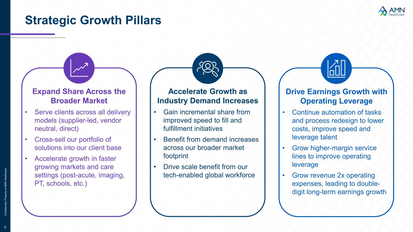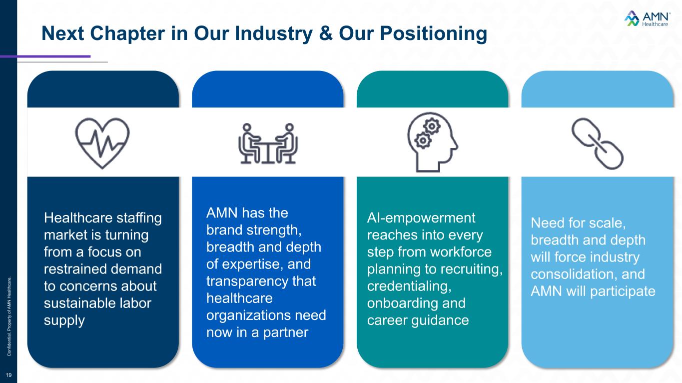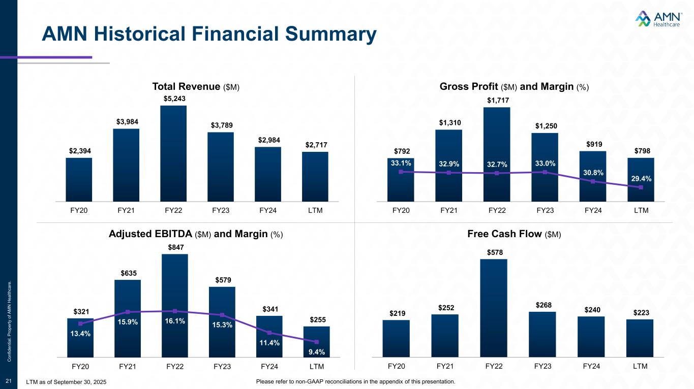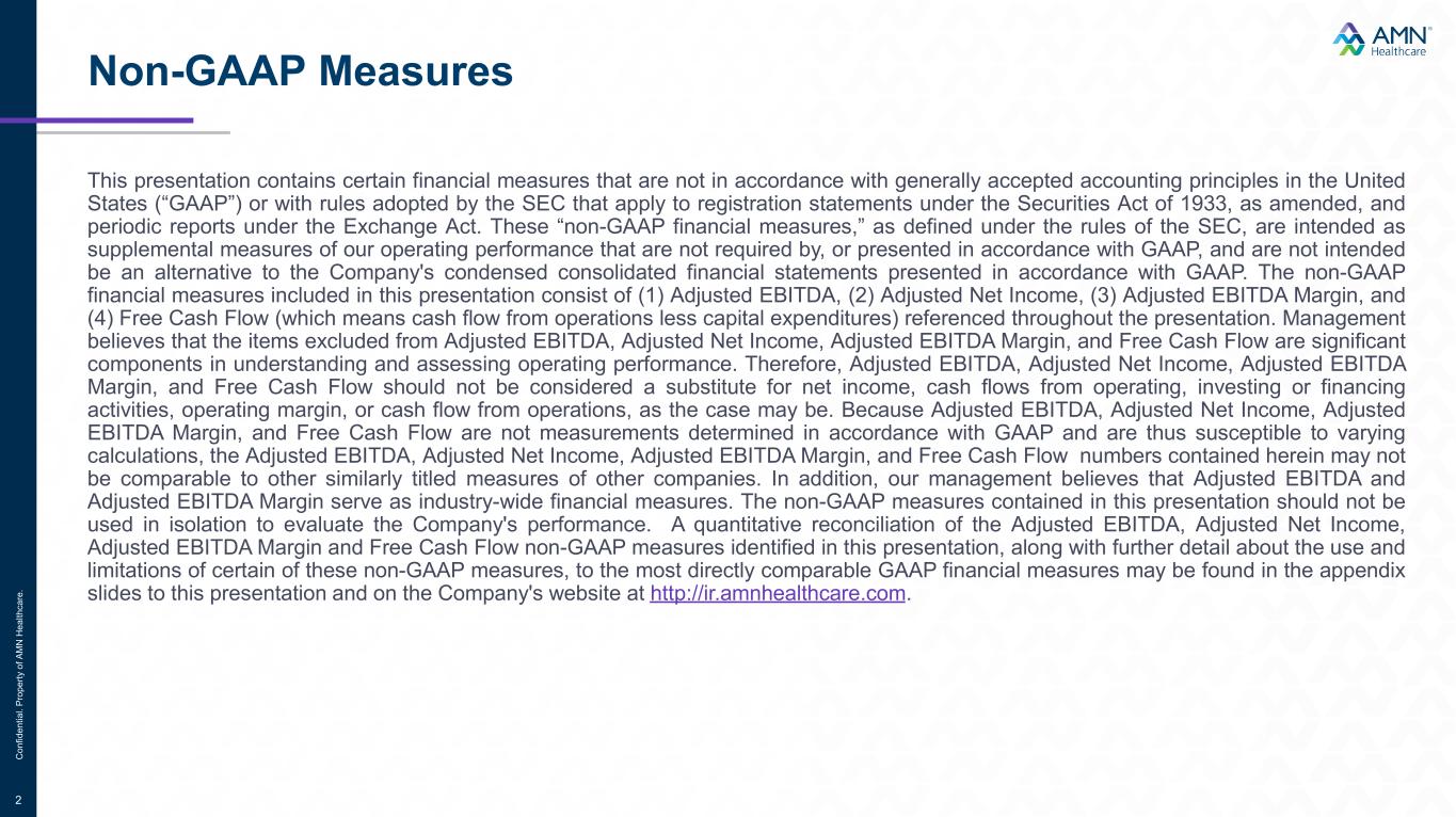 C o n fi d e n ti a l. P ro p e rt y o f A M N H e a lt h ca re . 2 Non-GAAP Measures This presentation contains certain financial measures that are not in accordance with generally accepted accounting principles in the United States (“GAAP”) or with rules adopted by the SEC that apply to registration statements under the Securities Act of 1933, as amended, and periodic reports under the Exchange Act. These “non-GAAP financial measures,” as defined under the rules of the SEC, are intended as supplemental measures of our operating performance that are not required by, or presented in accordance with GAAP, and are not intended be an alternative to the Company's condensed consolidated financial statements presented in accordance with GAAP. The non-GAAP financial measures included in this presentation consist of (1) Adjusted EBITDA, (2) Adjusted Net Income, (3) Adjusted EBITDA Margin, and (4) Free Cash Flow (which means cash flow from operations less capital expenditures) referenced throughout the presentation. Management believes that the items excluded from Adjusted EBITDA, Adjusted Net Income, Adjusted EBITDA Margin, and Free Cash Flow are significant components in understanding and assessing operating performance. Therefore, Adjusted EBITDA, Adjusted Net Income, Adjusted EBITDA Margin, and Free Cash Flow should not be considered a substitute for net income, cash flows from operating, investing or financing activities, operating margin, or cash flow from operations, as the case may be. Because Adjusted EBITDA, Adjusted Net Income, Adjusted EBITDA Margin, and Free Cash Flow are not measurements determined in accordance with GAAP and are thus susceptible to varying calculations, the Adjusted EBITDA, Adjusted Net Income, Adjusted EBITDA Margin, and Free Cash Flow numbers contained herein may not be comparable to other similarly titled measures of other companies. In addition, our management believes that Adjusted EBITDA and Adjusted EBITDA Margin serve as industry-wide financial measures. The non-GAAP measures contained in this presentation should not be used in isolation to evaluate the Company's performance. A quantitative reconciliation of the Adjusted EBITDA, Adjusted Net Income, Adjusted EBITDA Margin and Free Cash Flow non-GAAP measures identified in this presentation, along with further detail about the use and limitations of certain of these non-GAAP measures, to the most directly comparable GAAP financial measures may be found in the appendix slides to this presentation and on the Company's website at http://ir.amnhealthcare.com.