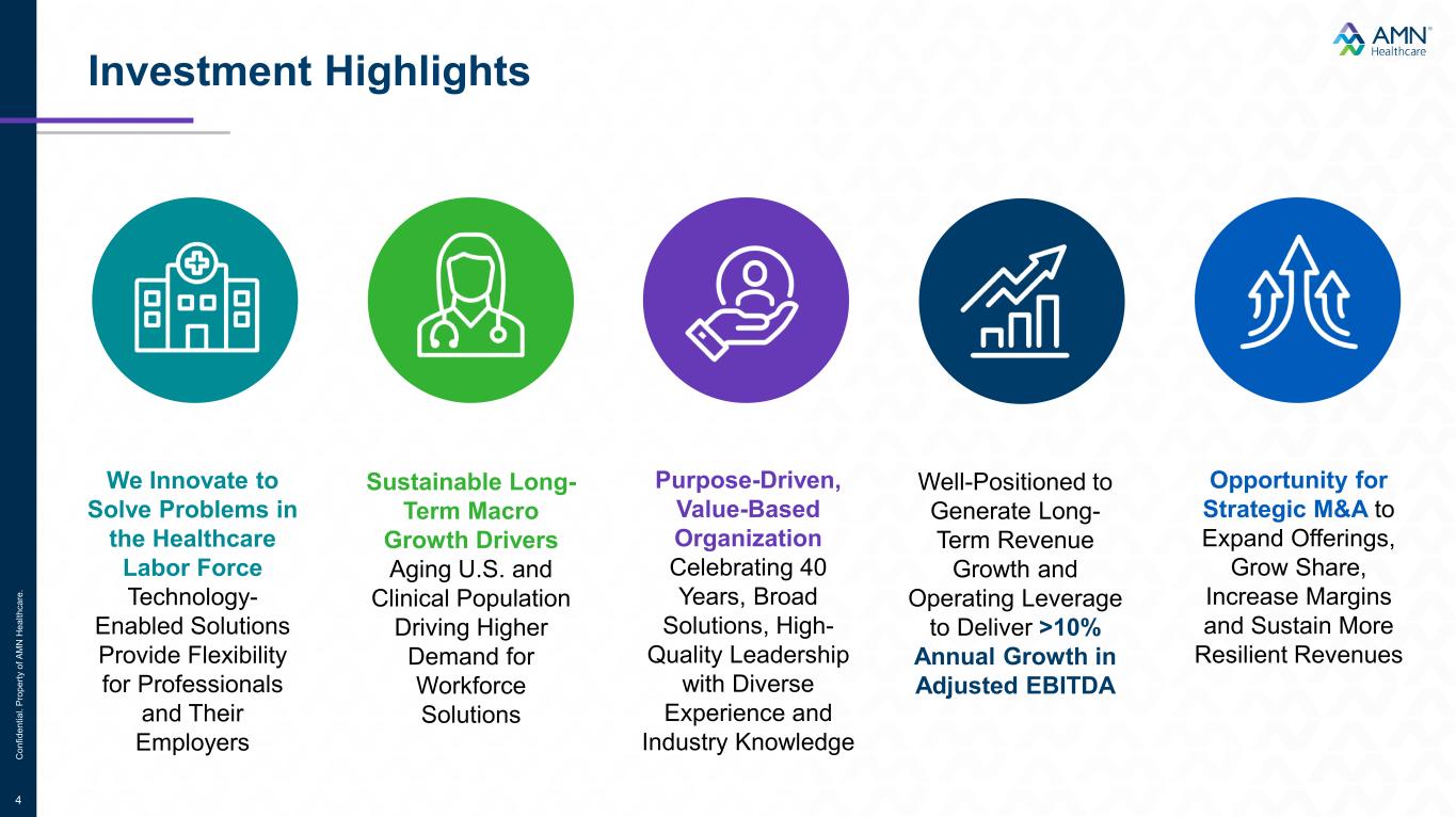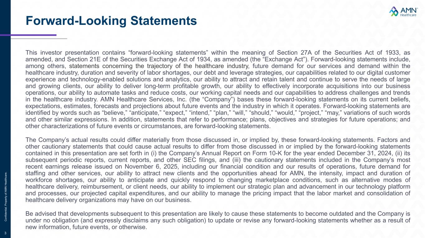 C o n fi d e n ti a l. P ro p e rt y o f A M N H e a lt h ca re . 3 Forward-Looking Statements This investor presentation contains “forward-looking statements” within the meaning of Section 27A of the Securities Act of 1933, as amended, and Section 21E of the Securities Exchange Act of 1934, as amended (the “Exchange Act”). Forward-looking statements include, among others, statements concerning the trajectory of the healthcare industry, future demand for our services and demand within the healthcare industry, duration and severity of labor shortages, our debt and leverage strategies, our capabilities related to our digital customer experience and technology-enabled solutions and analytics, our ability to attract and retain talent and continue to serve the needs of large and growing clients, our ability to deliver long-term profitable growth, our ability to effectively incorporate acquisitions into our business operations, our ability to automate tasks and reduce costs, our working capital needs and our capabilities to address challenges and trends in the healthcare industry. AMN Healthcare Services, Inc. (the “Company”) bases these forward-looking statements on its current beliefs, expectations, estimates, forecasts and projections about future events and the industry in which it operates. Forward-looking statements are identified by words such as “believe,” “anticipate,” “expect,” “intend,” “plan,” “will,” “should,” “would,” “project,” “may,” variations of such words and other similar expressions. In addition, statements that refer to performance; plans, objectives and strategies for future operations; and other characterizations of future events or circumstances, are forward-looking statements. The Company’s actual results could differ materially from those discussed in, or implied by, these forward-looking statements. Factors and other cautionary statements that could cause actual results to differ from those discussed in or implied by the forward-looking statements contained in this presentation are set forth in (i) the Company’s Annual Report on Form 10-K for the year ended December 31, 2024, (ii) its subsequent periodic reports, current reports, and other SEC filings, and (iii) the cautionary statements included in the Company’s most recent earnings release issued on November 6, 2025, including our financial condition and our results of operations, future demand for staffing and other services, our ability to attract new clients and the opportunities ahead for AMN, the intensity, impact and duration of workforce shortages, our ability to anticipate and quickly respond to changing marketplace conditions, such as alternative modes of healthcare delivery, reimbursement, or client needs, our ability to implement our strategic plan and advancement in our technology platform and processes, our projected capital expenditures, and our ability to manage the pricing impact that the labor market and consolidation of healthcare delivery organizations may have on our business. Be advised that developments subsequent to this presentation are likely to cause these statements to become outdated and the Company is under no obligation (and expressly disclaims any such obligation) to update or revise any forward-looking statements whether as a result of new information, future events, or otherwise.