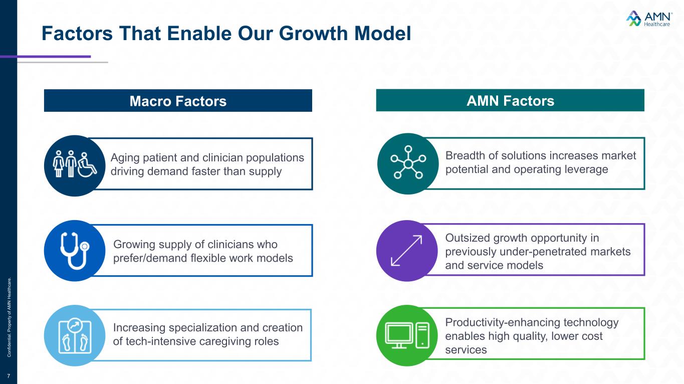 C o n fi d e n ti a l. P ro p e rt y o f A M N H e a lt h ca re . 6 Strategic Growth Pillars Expand Share Across the Broader Market • Serve clients across all delivery models (supplier-led, vendor neutral, direct) • Cross-sell our portfolio of solutions into our client base • Accelerate growth in faster growing markets and care settings (post-acute, imaging, PT, schools, etc.) Accelerate Growth as Industry Demand Increases • Gain incremental share from improved speed to fill and fulfillment initiatives • Benefit from demand increases across our broader market footprint • Drive scale benefit from our tech-enabled global workforce Drive Earnings Growth with Operating Leverage • Continue automation of tasks and process redesign to lower costs, improve speed and leverage talent • Grow higher-margin service lines to improve operating leverage • Grow revenue 2x operating expenses, leading to double- digit long-term earnings growth