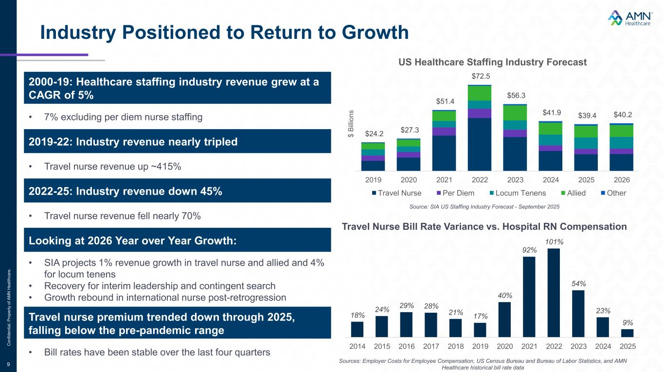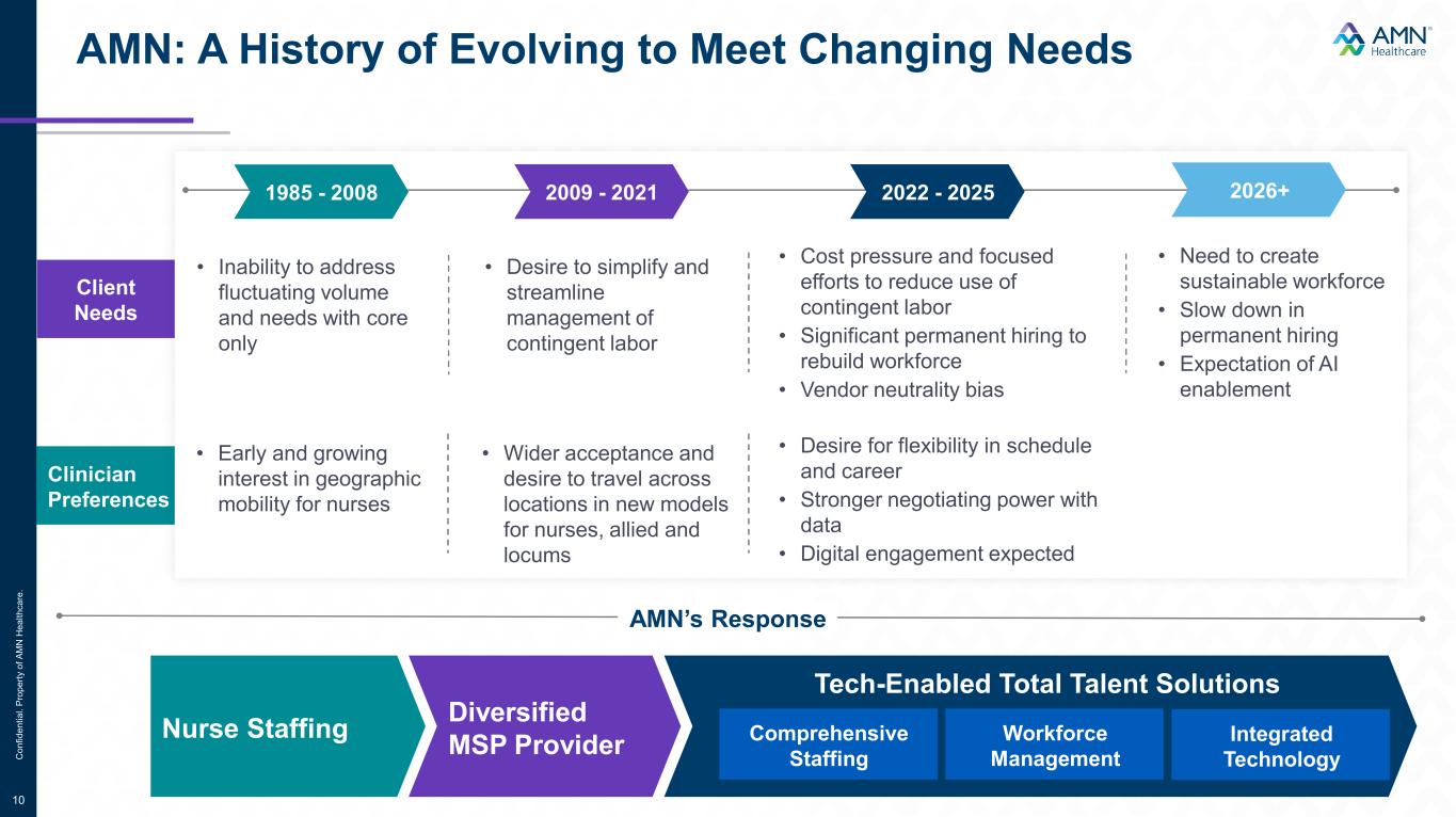C o n fi d e n ti a l. P ro p e rt y o f A M N H e a lt h ca re . 9 Industry Positioned to Return to Growth $24.2 $27.3 $51.4 $72.5 $56.3 $41.9 $39.4 $40.2 2019 2020 2021 2022 2023 2024 2025 2026 $ B ill io n s US Healthcare Staffing Industry Forecast Travel Nurse Per Diem Locum Tenens Allied Other Source: SIA US Staffing Industry Forecast - September 2025 18% 24% 29% 28% 21% 17% 40% 92% 101% 54% 23% 9% 2014 2015 2016 2017 2018 2019 2020 2021 2022 2023 2024 2025 Travel Nurse Bill Rate Variance vs. Hospital RN Compensation Sources: Employer Costs for Employee Compensation, US Census Bureau and Bureau of Labor Statistics, and AMN Healthcare historical bill rate data 2000-19: Healthcare staffing industry revenue grew at a CAGR of 5% • 7% excluding per diem nurse staffing 2019-22: Industry revenue nearly tripled • Travel nurse revenue up ~415% 2022-25: Industry revenue down 45% • Travel nurse revenue fell nearly 70% Looking at 2026 Year over Year Growth: • SIA projects 1% revenue growth in travel nurse and allied and 4% for locum tenens • Recovery for interim leadership and contingent search • Growth rebound in international nurse post-retrogression Travel nurse premium trended down through 2025, falling below the pre-pandemic range • Bill rates have been stable over the last four quarters