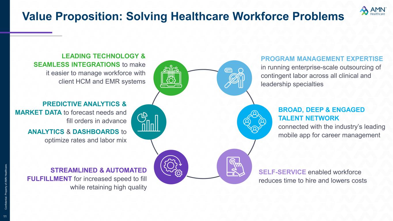 10 AMN: A History of Evolving to Meet Changing Needs Nurse Staffing Diversified MSP Provider AMN’s Response C o n fi d e n ti a l. P ro p e rt y o f A M N H e a lt h ca re . Comprehensive Staffing Tech-Enabled Total Talent Solutions Workforce Management Integrated Technology Client Needs Clinician Preferences • Desire for flexibility in schedule and career • Stronger negotiating power with data • Digital engagement expected • Early and growing interest in geographic mobility for nurses • Wider acceptance and desire to travel across locations in new models for nurses, allied and locums • Need to create sustainable workforce • Slow down in permanent hiring • Expectation of AI enablement • Cost pressure and focused efforts to reduce use of contingent labor • Significant permanent hiring to rebuild workforce • Vendor neutrality bias • Inability to address fluctuating volume and needs with core only • Desire to simplify and streamline management of contingent labor 1985 - 2008 2009 - 2021 2022 - 2025 2026+