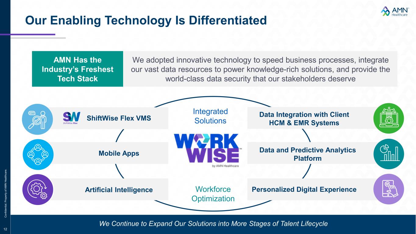 C o n fi d e n ti a l. P ro p e rt y o f A M N H e a lt h ca re . 11 Value Proposition: Solving Healthcare Workforce Problems LEADING TECHNOLOGY & SEAMLESS INTEGRATIONS to make it easier to manage workforce with client HCM and EMR systems PREDICTIVE ANALYTICS & MARKET DATA to forecast needs and fill orders in advance ANALYTICS & DASHBOARDS to optimize rates and labor mix PROGRAM MANAGEMENT EXPERTISE in running enterprise-scale outsourcing of contingent labor across all clinical and leadership specialties BROAD, DEEP & ENGAGED TALENT NETWORK connected with the industry’s leading mobile app for career management SELF-SERVICE enabled workforce reduces time to hire and lowers costs STREAMLINED & AUTOMATED FULFILLMENT for increased speed to fill while retaining high quality