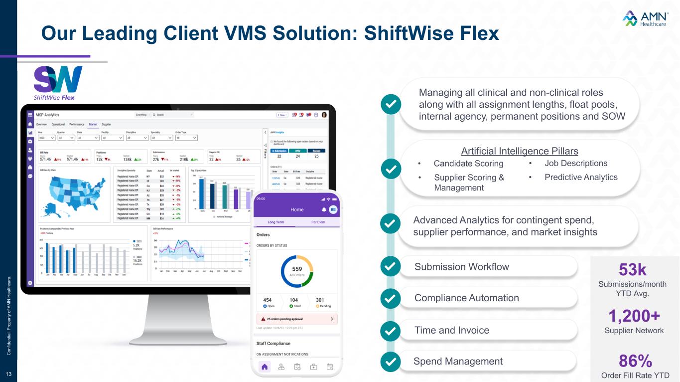 C o n fi d e n ti a l. P ro p e rt y o f A M N H e a lt h ca re . 12 Our Enabling Technology Is Differentiated We Continue to Expand Our Solutions into More Stages of Talent Lifecycle We adopted innovative technology to speed business processes, integrate our vast data resources to power knowledge-rich solutions, and provide the world-class data security that our stakeholders deserve AMN Has the Industry’s Freshest Tech Stack Mobile Apps Data and Predictive Analytics Platform Artificial Intelligence Personalized Digital Experience ShiftWise Flex VMS Data Integration with Client HCM & EMR Systems Integrated Solutions Workforce Optimization