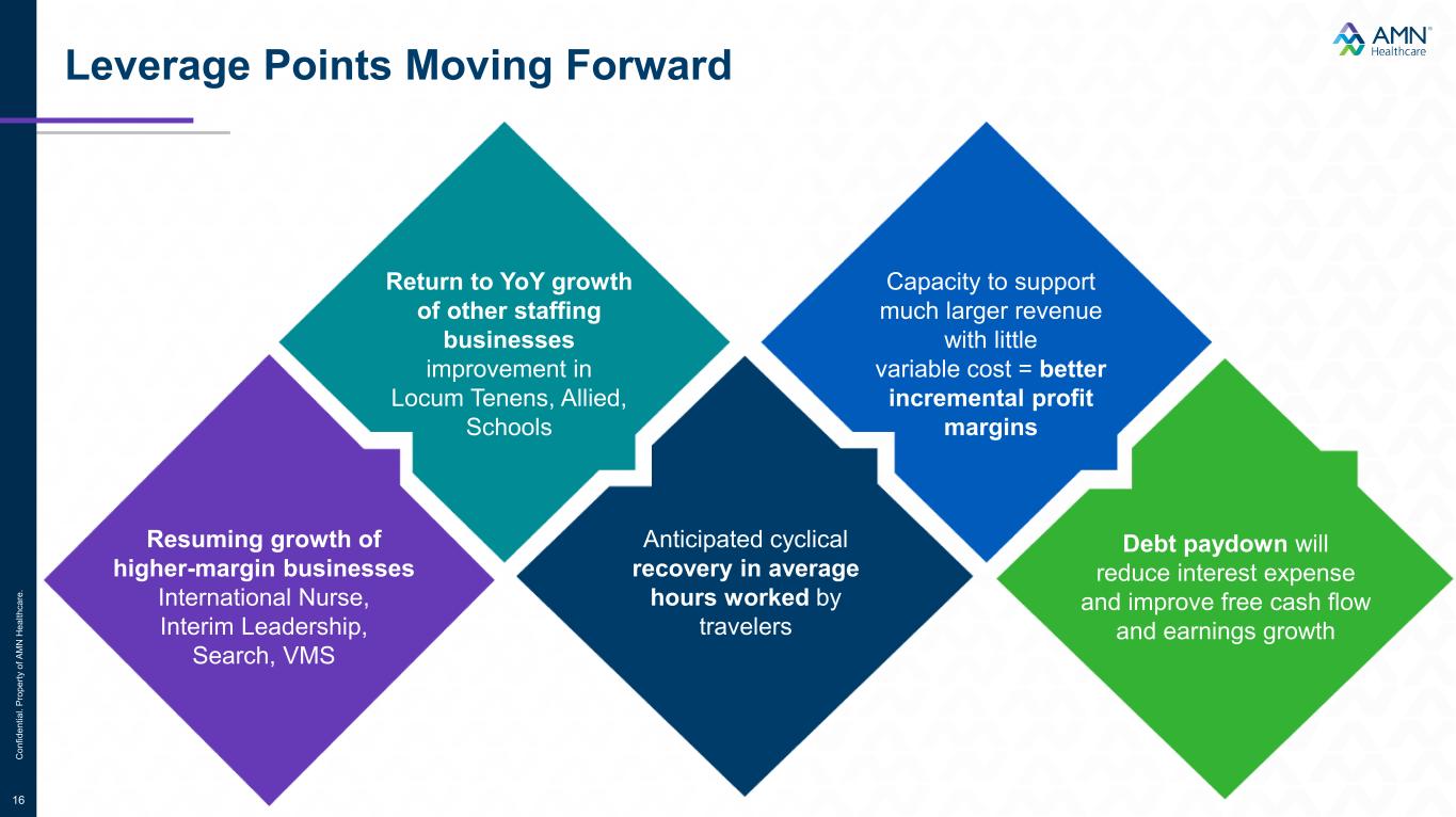 C o n fi d e n ti a l. P ro p e rt y o f A M N H e a lt h ca re . 15 Our Signs of Stabilization and Potential for Growth Revenue growth rebound in Locum Tenens MSP Demand improving for Interim Leadership and Search after multi- year decline Demand trend sets up for sequential revenue growth in these high-margin solutions Upswell in RFP pipeline with improved demand for MSPs Sharp improvement in enterprise client satisfaction scores Healthcare facilities slowed aggressive pace of permanent hiring, seeking greater labor cost flexibility More clients prioritizing higher order fill rates to address continued growth in patient volumes Client Relationships Physician & Leadership Solutions Nurse & Allied Solutions Nurse/Allied Q425 sequential growth of 5% Bill rates trending modestly higher as clients seek better fill rates Expecting 15-20% YoY growth in 2026 for International Nurse Potential for Nurse and Allied gross margin to improve from Q4’25 level Doubled our vendor-neutral direct fill rate YoY in 2025, with more opportunity to expand • Best Q4 seq. volume growth since 2021 • Winter orders up 16% YoY