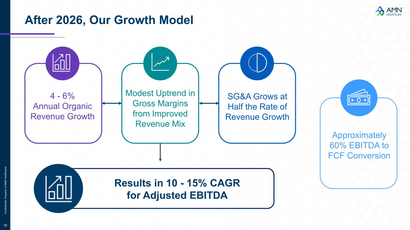 C o n fi d e n ti a l. P ro p e rt y o f A M N H e a lt h ca re . 17 Q4 2025 Annualized Run Rate Excluding Large Labor Disruption Event 2026 Base Scenario 2026 Sets the Base for Future Growth Revenue $2.5 Billion Gross Margin ~27% Adjusted EBITDA Margin ~6% 2026 Revenue Building from Normalized Q4 Run Rate Consolidated Gross Margin Up 50-100 bp Gross margin expansion primarily from revenue mix shift Adjusted EBITDA Margin Up 50-100 bp Atypical Factors Q4 25 • ~$100M labor disruption revenue • Gross margin ~100 bp lower from labor disruption event timing • Lower variable comp run rate in quarter 2026 Factors • International nurse business recovery • Physician and Leadership segment revenue growth from seasonally low Q4 • Assuming $30M labor disruption revenue Based on Q4’25 Guidance