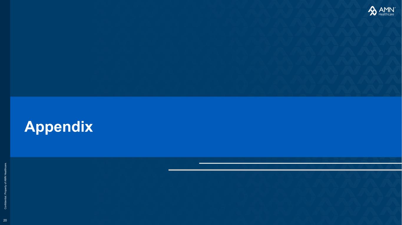C o n fi d e n ti a l. P ro p e rt y o f A M N H e a lt h ca re . 19 Next Chapter in Our Industry & Our Positioning Healthcare staffing market is turning from a focus on restrained demand to concerns about sustainable labor supply AI-empowerment reaches into every step from workforce planning to recruiting, credentialing, onboarding and career guidance AMN has the brand strength, breadth and depth of expertise, and transparency that healthcare organizations need now in a partner Need for scale, breadth and depth will force industry consolidation, and AMN will participate