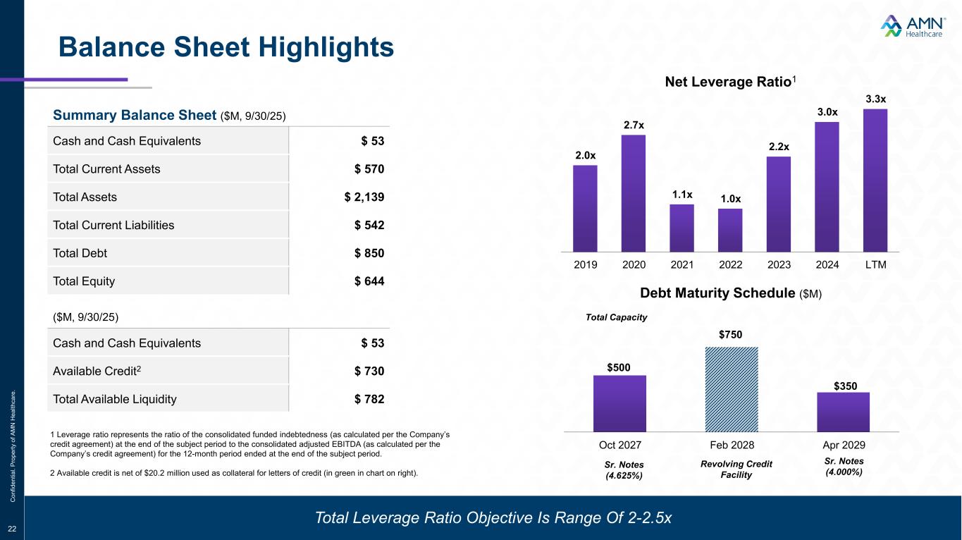 C o n fi d e n ti a l. P ro p e rt y o f A M N H e a lt h ca re . 21 AMN Historical Financial Summary Total Revenue ($M) Gross Profit ($M) and Margin (%) Adjusted EBITDA ($M) and Margin (%) Free Cash Flow ($M) $2,394 $3,984 $5,243 $3,789 $2,984 $2,717 FY20 FY21 FY22 FY23 FY24 LTM $792 $1,310 $1,717 $1,250 $919 $798 33.1% 32.9% 32.7% 33.0% 30.8% 29.4% 26.0% 31.0% 36.0% 41.0% 46.0% 51.0% $- $200 $400 $600 $800 $1,000 $1,200 $1,400 $1,600 $1,800 $2,000 FY20 FY21 FY22 FY23 FY24 LTM $321 $635 $847 $579 $341 $255 13.4% 15.9% 16.1% 15.3% 11.4% 9.4% 6.0% 11.0% 16.0% 21.0% 26.0% $- $100 $200 $300 $400 $500 $600 $700 $800 $900 FY20 FY21 FY22 FY23 FY24 LTM Please refer to non-GAAP reconciliations in the appendix of this presentation. $219 $252 $578 $268 $240 $223 0.31 0.32 0.33 0.34 0.35 0.36 0.37 0.38 0.39 0.4 $(50) $50 $150 $250 $350 $450 $550 $650 FY20 FY21 FY22 FY23 FY24 LTM LTM as of September 30, 2025