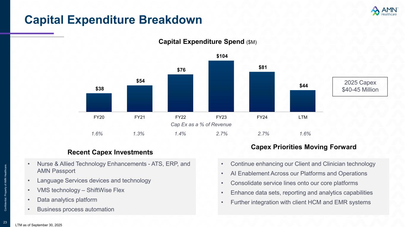C o n fi d e n ti a l. P ro p e rt y o f A M N H e a lt h ca re . 22 Balance Sheet Highlights 1 Leverage ratio represents the ratio of the consolidated funded indebtedness (as calculated per the Company’s credit agreement) at the end of the subject period to the consolidated adjusted EBITDA (as calculated per the Company’s credit agreement) for the 12-month period ended at the end of the subject period. 2 Available credit is net of $20.2 million used as collateral for letters of credit (in green in chart on right). Summary Balance Sheet ($M, 9/30/25) Cash and Cash Equivalents $ 53 Total Current Assets $ 570 Total Assets $ 2,139 Total Current Liabilities $ 542 Total Debt $ 850 Total Equity $ 644 ($M, 9/30/25) Cash and Cash Equivalents $ 53 Available Credit2 $ 730 Total Available Liquidity $ 782 $500 $350 Oct 2027 Feb 2028 Apr 2029 Debt Maturity Schedule ($M) 2.0x 2.7x 1.1x 1.0x 2.2x 3.0x 3.3x 2019 2020 2021 2022 2023 2024 LTM Net Leverage Ratio1 Sr. Notes (4.000%) Revolving Credit Facility Sr. Notes (4.625%) Total Capacity Total Leverage Ratio Objective Is Range Of 2-2.5x $750