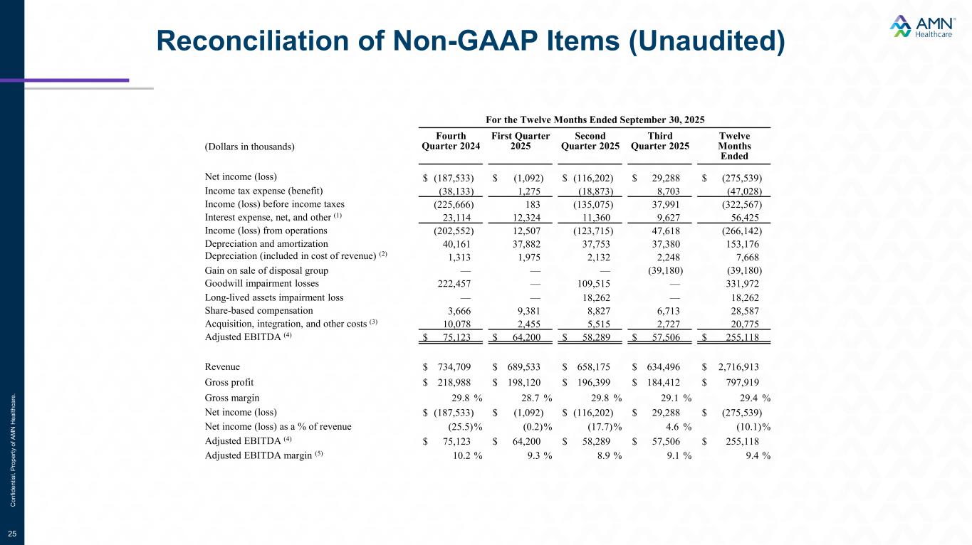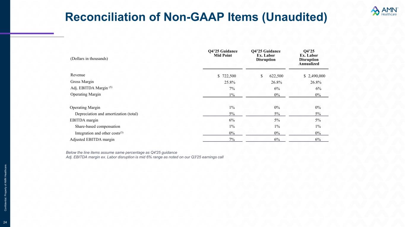 Reconciliation of Non-GAAP Items (Unaudited) C o n fi d e n ti a l. P ro p e rt y o f A M N H e a lt h ca re . 24 (Dollars in thousands) Q4’25 Guidance Mid Point Q4’25 Guidance Ex. Labor Disruption Q4’25 Ex. Labor Disruption Annualized Revenue $ 722,500 $ 622,500 $ 2,490,000 Gross Margin 25.8% 26.8% 26.8% Adj. EBITDA Margin (5) 7% 6% 6% Operating Margin 1% 0% 0% Operating Margin 1% 0% 0% Depreciation and amortization (total) 5% 5% 5% EBITDA margin 6% 5% 5% Share-based compensation 1% 1% 1% Integration and other costs(3) 0% 0% 0% Adjusted EBITDA margin 7% 6% 6% Below the line items assume same percentage as Q4'25 guidance Adj. EBITDA margin ex. Labor disruption is mid 6% range as noted on our Q3'25 earnings call