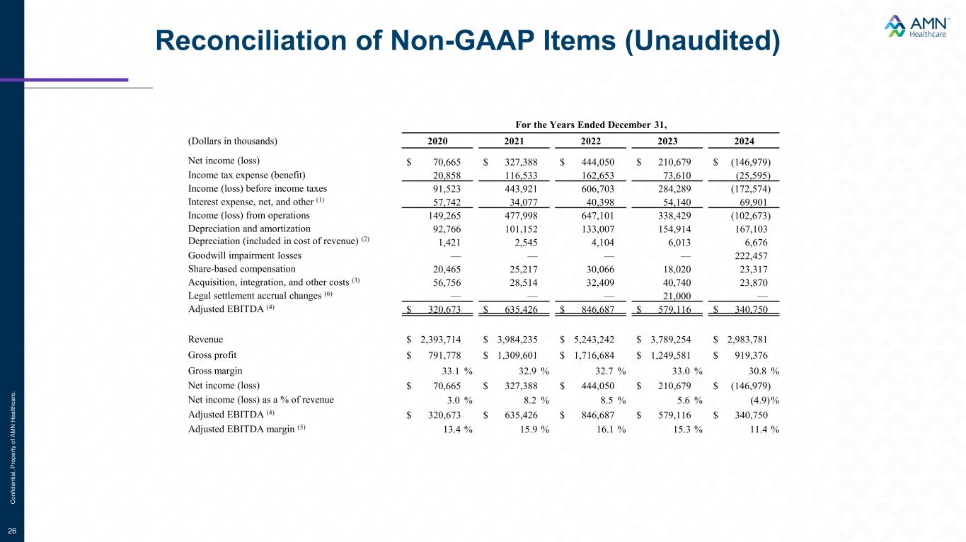 Reconciliation of Non-GAAP Items (Unaudited) C o n fi d e n ti a l. P ro p e rt y o f A M N H e a lt h ca re . 25 For the Twelve Months Ended September 30, 2025 (Dollars in thousands) Fourth Quarter 2024 First Quarter 2025 Second Quarter 2025 Third Quarter 2025 Twelve Months Ended Net income (loss) $ (187,533) $ (1,092) $ (116,202) $ 29,288 $ (275,539) Income tax expense (benefit) (38,133) 1,275 (18,873) 8,703 (47,028) Income (loss) before income taxes (225,666) 183 (135,075) 37,991 (322,567) Interest expense, net, and other (1) 23,114 12,324 11,360 9,627 56,425 Income (loss) from operations (202,552) 12,507 (123,715) 47,618 (266,142) Depreciation and amortization 40,161 37,882 37,753 37,380 153,176 Depreciation (included in cost of revenue) (2) 1,313 1,975 2,132 2,248 7,668 Gain on sale of disposal group — — — (39,180) (39,180) Goodwill impairment losses 222,457 — 109,515 — 331,972 Long-lived assets impairment loss — — 18,262 — 18,262 Share-based compensation 3,666 9,381 8,827 6,713 28,587 Acquisition, integration, and other costs (3) 10,078 2,455 5,515 2,727 20,775 Adjusted EBITDA (4) $ 75,123 $ 64,200 $ 58,289 $ 57,506 $ 255,118 Revenue $ 734,709 $ 689,533 $ 658,175 $ 634,496 $ 2,716,913 Gross profit $ 218,988 $ 198,120 $ 196,399 $ 184,412 $ 797,919 Gross margin 29.8 % 28.7 % 29.8 % 29.1 % 29.4 % Net income (loss) $ (187,533) $ (1,092) $ (116,202) $ 29,288 $ (275,539) Net income (loss) as a % of revenue (25.5)% (0.2)% (17.7)% 4.6 % (10.1)% Adjusted EBITDA (4) $ 75,123 $ 64,200 $ 58,289 $ 57,506 $ 255,118 Adjusted EBITDA margin (5) 10.2 % 9.3 % 8.9 % 9.1 % 9.4 %