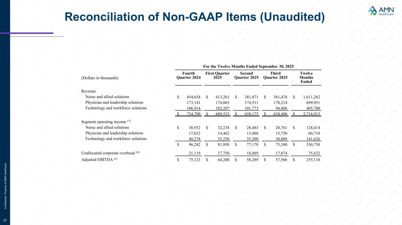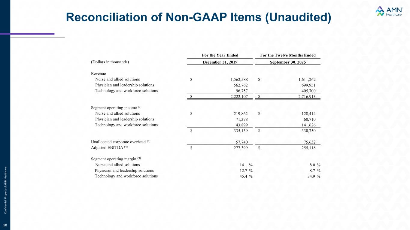 Reconciliation of Non-GAAP Items (Unaudited) C o n fi d e n ti a l. P ro p e rt y o f A M N H e a lt h ca re . 27 For the Twelve Months Ended September 30, 2025 (Dollars in thousands) Fourth Quarter 2024 First Quarter 2025 Second Quarter 2025 Third Quarter 2025 Twelve Months Ended Revenue Nurse and allied solutions $ 454,654 $ 413,261 $ 381,871 $ 361,476 $ 1,611,262 Physician and leadership solutions 173,141 174,065 174,531 178,214 699,951 Technology and workforce solutions 106,914 102,207 101,773 94,806 405,700 $ 734,709 $ 689,533 $ 658,175 $ 634,496 $ 2,716,913 Segment operating income (7) Nurse and allied solutions $ 38,932 $ 32,238 $ 28,483 $ 28,761 $ 128,414 Physician and leadership solutions 17,032 14,462 13,486 15,730 60,710 Technology and workforce solutions 40,278 35,250 35,209 30,889 141,626 $ 96,242 $ 81,950 $ 77,178 $ 75,380 $ 330,750 Unallocated corporate overhead (8) 21,119 17,750 18,889 17,874 75,632 Adjusted EBITDA (4) $ 75,123 $ 64,200 $ 58,289 $ 57,506 $ 255,118