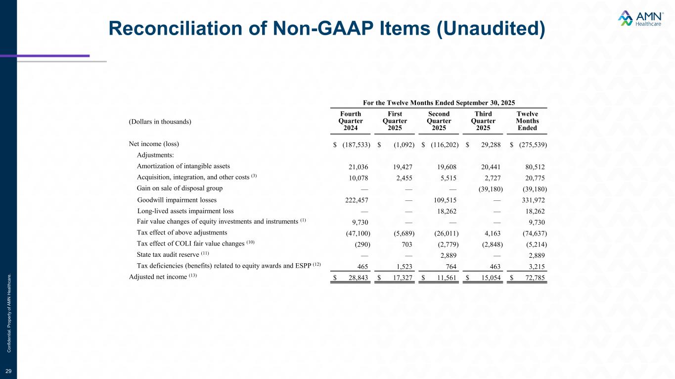 Reconciliation of Non-GAAP Items (Unaudited) C o n fi d e n ti a l. P ro p e rt y o f A M N H e a lt h ca re . 29 For the Twelve Months Ended September 30, 2025 (Dollars in thousands) Fourth Quarter 2024 First Quarter 2025 Second Quarter 2025 Third Quarter 2025 Twelve Months Ended Net income (loss) $ (187,533) $ (1,092) $ (116,202) $ 29,288 $ (275,539) Adjustments: Amortization of intangible assets 21,036 19,427 19,608 20,441 80,512 Acquisition, integration, and other costs (3) 10,078 2,455 5,515 2,727 20,775 Gain on sale of disposal group — — — (39,180) (39,180) Goodwill impairment losses 222,457 — 109,515 — 331,972 Long-lived assets impairment loss — — 18,262 — 18,262 Fair value changes of equity investments and instruments (1) 9,730 — — — 9,730 Tax effect of above adjustments (47,100) (5,689) (26,011) 4,163 (74,637) Tax effect of COLI fair value changes (10) (290) 703 (2,779) (2,848) (5,214) State tax audit reserve (11) — — 2,889 — 2,889 Tax deficiencies (benefits) related to equity awards and ESPP (12) 465 1,523 764 463 3,215 Adjusted net income (13) $ 28,843 $ 17,327 $ 11,561 $ 15,054 $ 72,785
