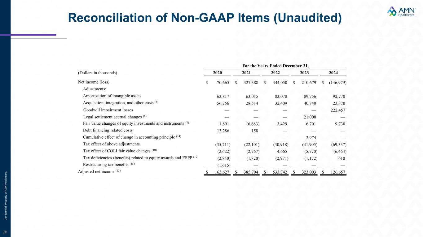 Reconciliation of Non-GAAP Items (Unaudited) C o n fi d e n ti a l. P ro p e rt y o f A M N H e a lt h ca re . 30 For the Years Ended December 31, (Dollars in thousands) 2020 2021 2022 2023 2024 Net income (loss) $ 70,665 $ 327,388 $ 444,050 $ 210,679 $ (146,979) Adjustments: Amortization of intangible assets 63,817 63,015 83,078 89,756 92,770 Acquisition, integration, and other costs (3) 56,756 28,514 32,409 40,740 23,870 Goodwill impairment losses — — — — 222,457 Legal settlement accrual changes (6) — — — 21,000 — Fair value changes of equity investments and instruments (1) 1,891 (6,683) 3,429 6,701 9,730 Debt financing related costs 13,286 158 — — — Cumulative effect of change in accounting principle (14) — — — 2,974 — Tax effect of above adjustments (35,711) (22,101) (30,918) (41,905) (69,337) Tax effect of COLI fair value changes (10) (2,622) (2,767) 4,665 (5,770) (6,464) Tax deficiencies (benefits) related to equity awards and ESPP (12) (2,840) (1,820) (2,971) (1,172) 610 Restructuring tax benefits (15) (1,615) — — — — Adjusted net income (13) $ 163,627 $ 385,704 $ 533,742 $ 323,003 $ 126,657