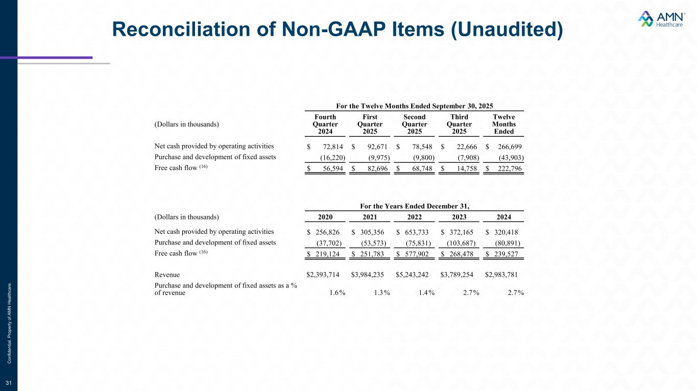 Reconciliation of Non-GAAP Items (Unaudited) C o n fi d e n ti a l. P ro p e rt y o f A M N H e a lt h ca re . 31 For the Twelve Months Ended September 30, 2025 (Dollars in thousands) Fourth Quarter 2024 First Quarter 2025 Second Quarter 2025 Third Quarter 2025 Twelve Months Ended Net cash provided by operating activities $ 72,814 $ 92,671 $ 78,548 $ 22,666 $ 266,699 Purchase and development of fixed assets (16,220) (9,975) (9,800) (7,908) (43,903) Free cash flow (16) $ 56,594 $ 82,696 $ 68,748 $ 14,758 $ 222,796 For the Years Ended December 31, (Dollars in thousands) 2020 2021 2022 2023 2024 Net cash provided by operating activities $ 256,826 $ 305,356 $ 653,733 $ 372,165 $ 320,418 Purchase and development of fixed assets (37,702) (53,573) (75,831) (103,687) (80,891) Free cash flow (16) $ 219,124 $ 251,783 $ 577,902 $ 268,478 $ 239,527 Revenue $2,393,714 $3,984,235 $5,243,242 $3,789,254 $2,983,781 Purchase and development of fixed assets as a % of revenue 1.6% 1.3% 1.4% 2.7% 2.7%