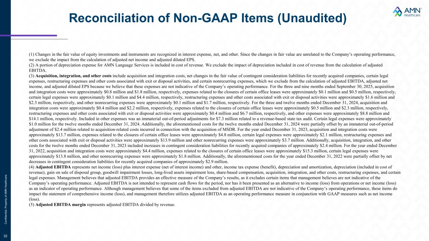 Reconciliation of Non-GAAP Items (Unaudited) C o n fi d e n ti a l. P ro p e rt y o f A M N H e a lt h ca re . 32 (1) Changes in the fair value of equity investments and instruments are recognized in interest expense, net, and other. Since the changes in fair value are unrelated to the Company’s operating performance, we exclude the impact from the calculation of adjusted net income and adjusted diluted EPS. (2) A portion of depreciation expense for AMN Language Services is included in cost of revenue. We exclude the impact of depreciation included in cost of revenue from the calculation of adjusted EBITDA. (3) Acquisition, integration, and other costs include acquisition and integration costs, net changes in the fair value of contingent consideration liabilities for recently acquired companies, certain legal expenses, restructuring expenses and other costs associated with exit or disposal activities, and certain nonrecurring expenses, which we exclude from the calculation of adjusted EBITDA, adjusted net income, and adjusted diluted EPS because we believe that these expenses are not indicative of the Company’s operating performance. For the three and nine months ended September 30, 2025, acquisition and integration costs were approximately $0.8 million and $1.8 million, respectively, expenses related to the closures of certain office leases were approximately $0.1 million and $0.5 million, respectively, certain legal expenses were approximately $0.1 million and $4.4 million, respectively, restructuring expenses and other costs associated with exit or disposal activities were approximately $1.6 million and $2.3 million, respectively, and other nonrecurring expenses were approximately $0.1 million and $1.7 million, respectively. For the three and twelve months ended December 31, 2024, acquisition and integration costs were approximately $0.4 million and $2.2 million, respectively, expenses related to the closures of certain office leases were approximately $0.5 million and $2.3 million, respectively, restructuring expenses and other costs associated with exit or disposal activities were approximately $0.4 million and $6.7 million, respectively, and other expenses were approximately $8.8 million and $14.1 million, respectively. Included in other expenses was an immaterial out-of-period adjustments for $7.3 million related to a revenue-based state tax audit. Certain legal expenses were approximately $1.0 million for the twelve months ended December 31, 2024. Additionally, the aforementioned costs for the twelve months ended December 31, 2024 were partially offset by an immaterial out-of-period adjustment of $2.4 million related to acquisition-related costs incurred in connection with the acquisition of MSDR. For the year ended December 31, 2023, acquisition and integration costs were approximately $13.7 million, expenses related to the closures of certain office leases were approximately $4.8 million, certain legal expenses were approximately $2.1 million, restructuring expenses and other costs associated with exit or disposal activities were approximately $13.9 million and other nonrecurring expenses were approximately $3.7 million. Additionally, acquisition, integration, and other costs for the twelve months ended December 31, 2023 included increases in contingent consideration liabilities for recently acquired companies of approximately $2.4 million. For the year ended December 31, 2022, acquisition and integration costs were approximately $4.4 million, expenses related to the closures of certain office leases were approximately $15.3 million, certain legal expenses were approximately $13.8 million, and other nonrecurring expenses were approximately $1.8 million. Additionally, the aforementioned costs for the year ended December 31, 2022 were partially offset by net decreases in contingent consideration liabilities for recently acquired companies of approximately $2.9 million. (4) Adjusted EBITDA represents net income (loss) plus interest expense (net of interest income) and other, income tax expense (benefit), depreciation and amortization, depreciation (included in cost of revenue), gain on sale of disposal group, goodwill impairment losses, long-lived assets impairment loss, share-based compensation, acquisition, integration, and other costs, restructuring expenses, and certain legal expenses. Management believes that adjusted EBITDA provides an effective measure of the Company’s results, as it excludes certain items that management believes are not indicative of the Company’s operating performance. Adjusted EBITDA is not intended to represent cash flows for the period, nor has it been presented as an alternative to income (loss) from operations or net income (loss) as an indicator of operating performance. Although management believes that some of the items excluded from adjusted EBITDA are not indicative of the Company’s operating performance, these items do impact the statement of comprehensive income (loss), and management therefore utilizes adjusted EBITDA as an operating performance measure in conjunction with GAAP measures such as net income (loss). (5) Adjusted EBITDA margin represents adjusted EBITDA divided by revenue.